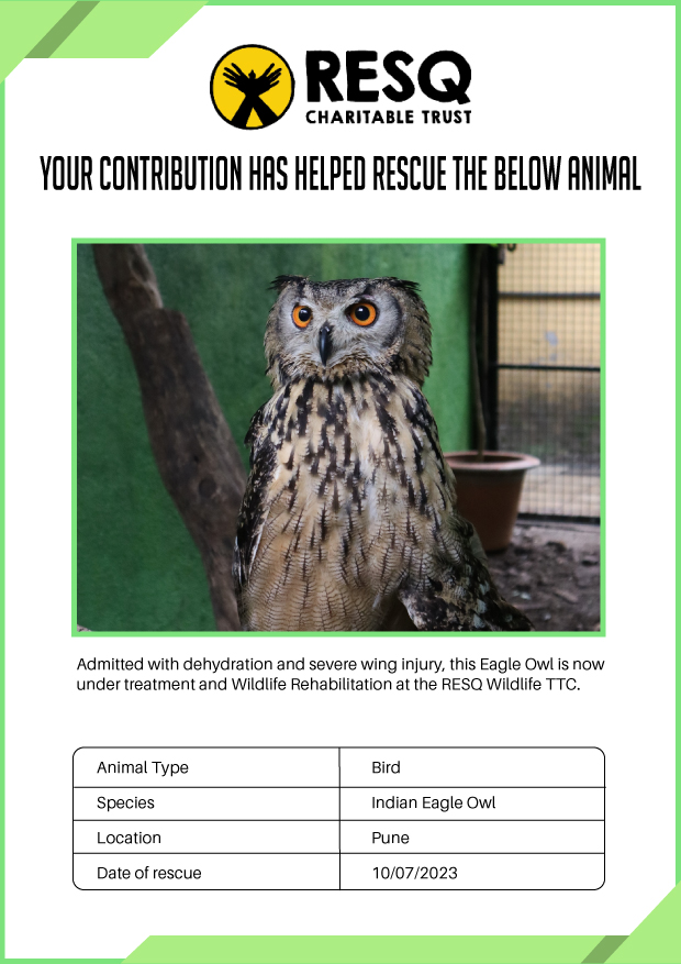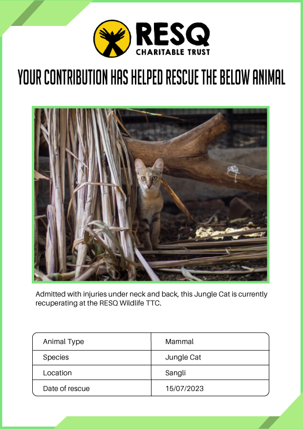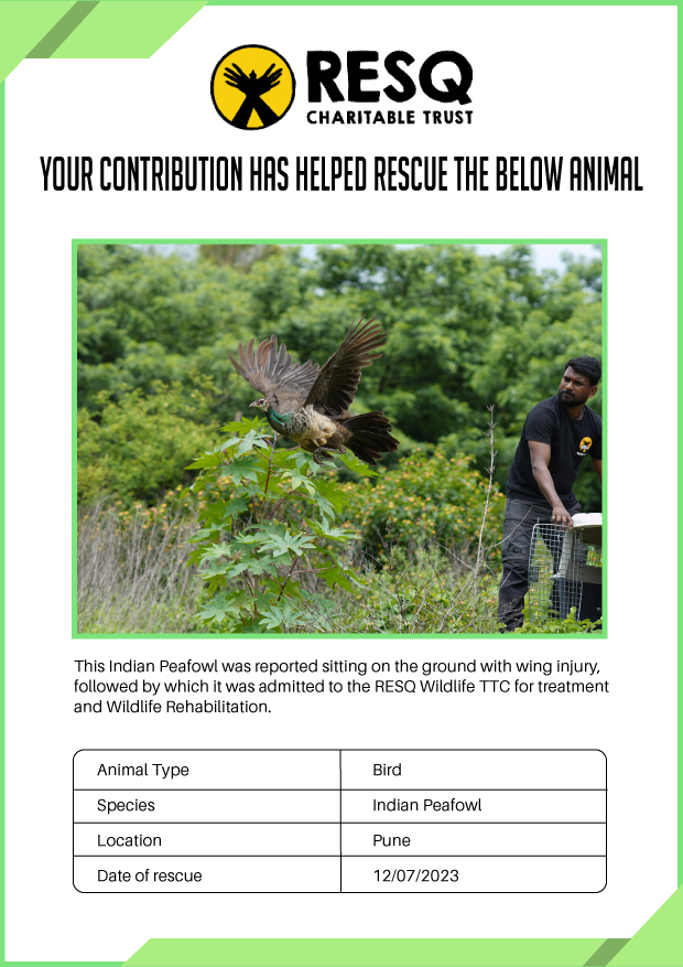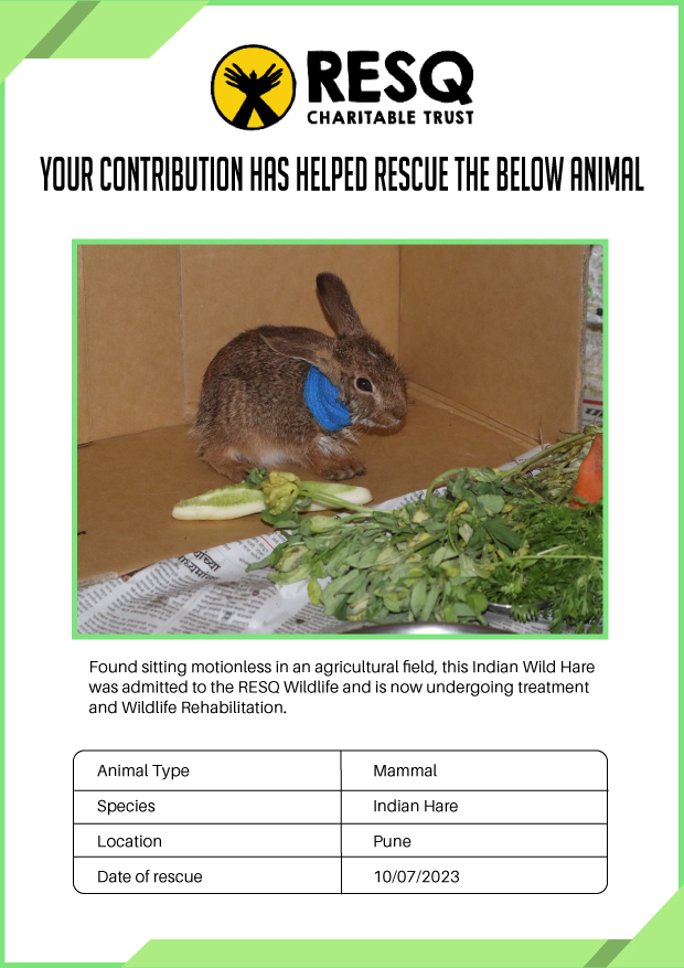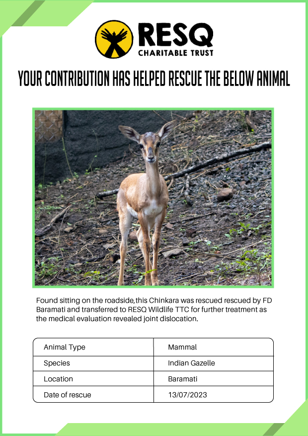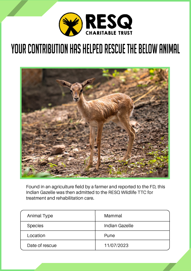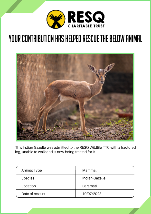 Maharashtra is home to a diverse population of wild animals, many of whom are key species identified to be globally declining. The Pune-based NGO - RESQ provides emergency aid to animals in distress. Thousands of wild animals come to RESQ annually who are either injured, sick, orphaned, or victims of wildlife trafficking and illegal captivity.