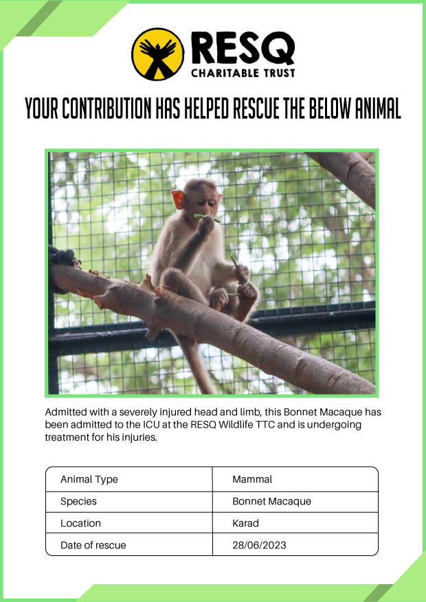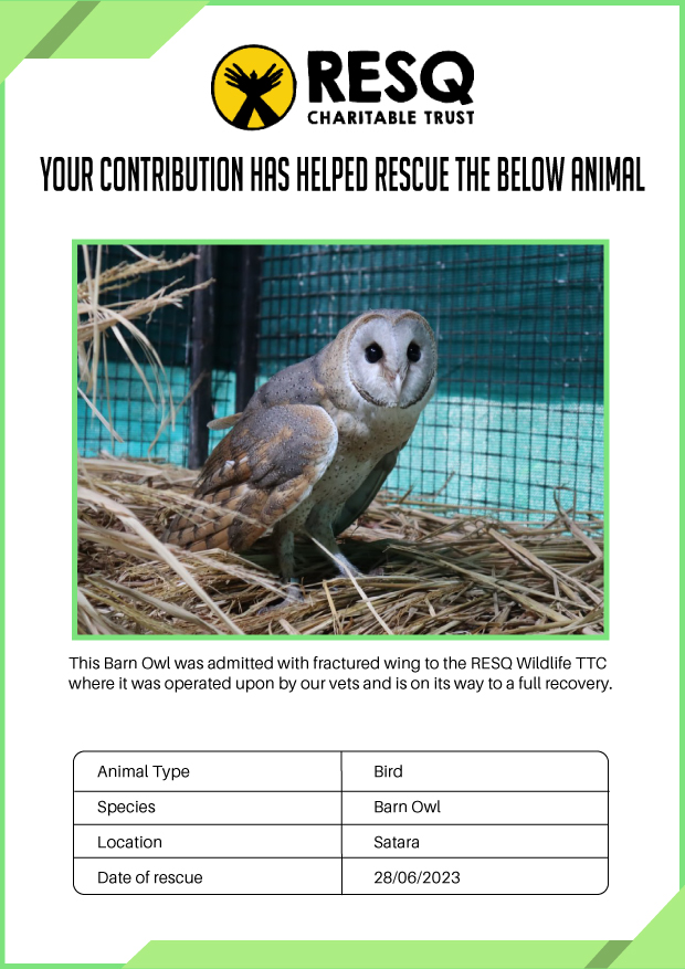 Maharashtra is home to a diverse population of wild animals, many of whom are key species identified to be globally declining. The Pune-based NGO - RESQ provides emergency aid to animals in distress. Thousands of wild animals come to RESQ annually who are either injured, sick, orphaned, or victims of wildlife trafficking and illegal captivity.