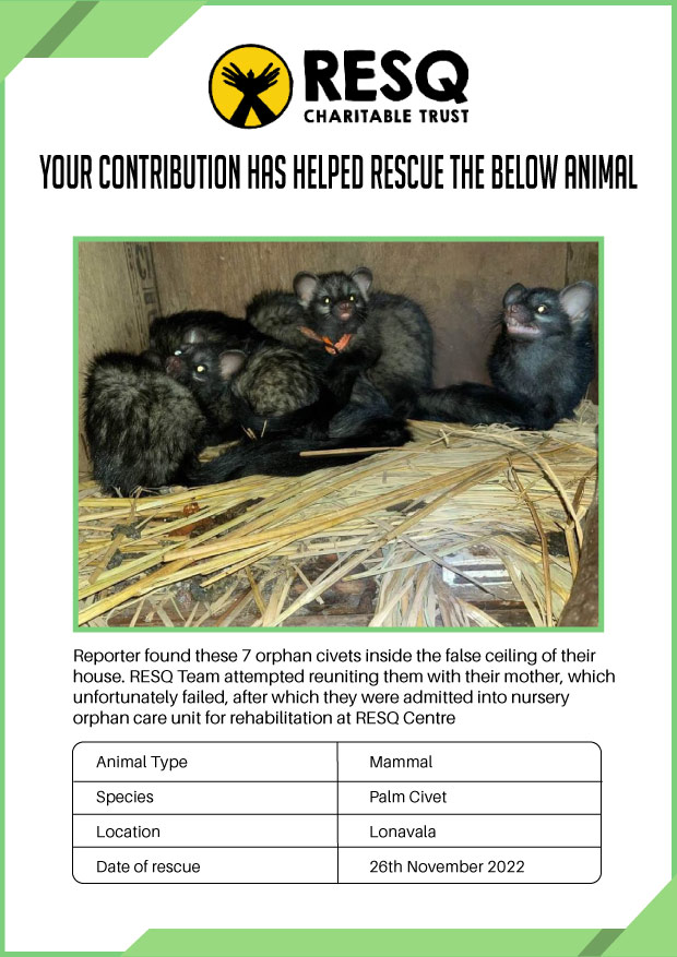 RESQ was founded in 2007 to provide emergency aid to animals in distress. Since then, the rescue and rehabilitation work of the organisation has provided aid to thousands of animals of over 200+ species, improved public health and safety outcomes, and actively worked on preventing human-animal conflict across multiple urban and rural ecosystems.