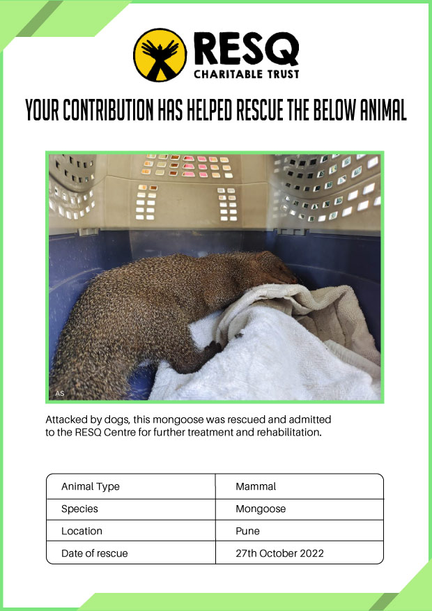 Maharashtra is home to a diverse population of wild animals, many of whom are key species identified to be globally declining. The Pune-based NGO - RESQ provides emergency aid to animals in distress. Thousands of wild animals come to RESQ annually who are either injured, sick, orphaned, or victims of wildlife trafficking and illegal captivity.