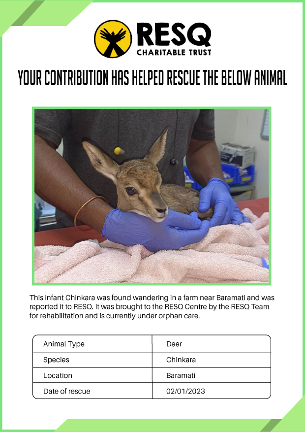 Maharashtra is home to a diverse population of wild animals, many of whom are key species identified to be globally declining. The Pune-based NGO - RESQ provides emergency aid to animals in distress. Thousands of wild animals come to RESQ annually who are either injured, sick, orphaned, or victims of wildlife trafficking and illegal captivity.