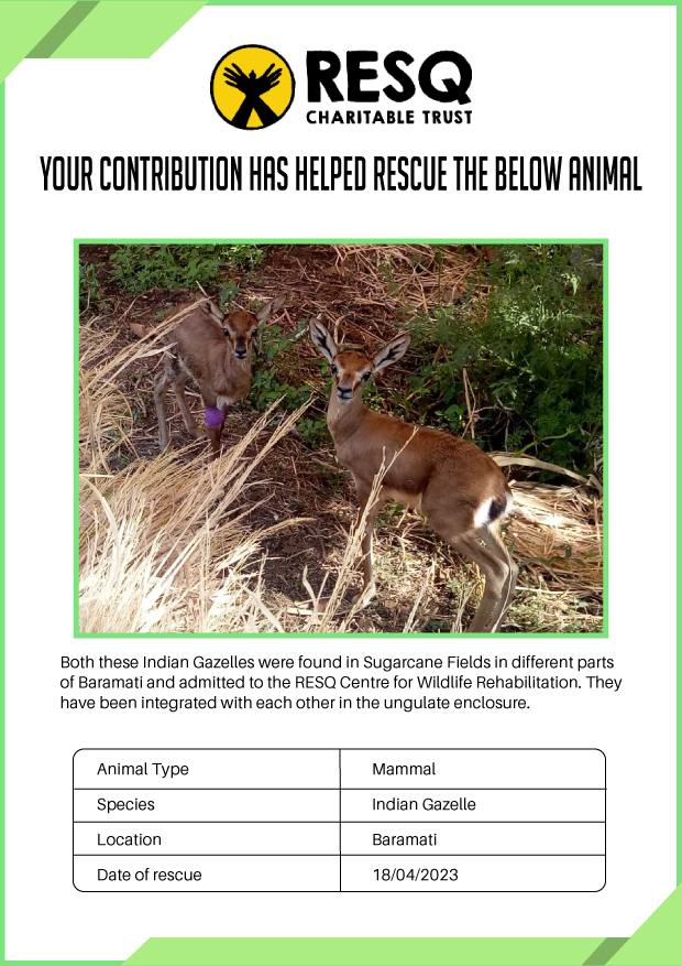 Maharashtra is home to a diverse population of wild animals, many of whom are key species identified to be globally declining. The Pune-based NGO - RESQ provides emergency aid to animals in distress. Thousands of wild animals come to RESQ annually who are either injured, sick, orphaned, or victims of wildlife trafficking and illegal captivity.
