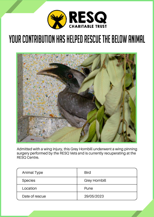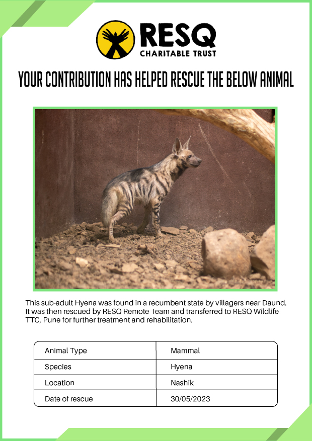 Maharashtra is home to a diverse population of wild animals, many of whom are key species identified to be globally declining. The Pune-based NGO - RESQ provides emergency aid to animals in distress. Thousands of wild animals come to RESQ annually who are either injured, sick, orphaned, or victims of wildlife trafficking and illegal captivity.