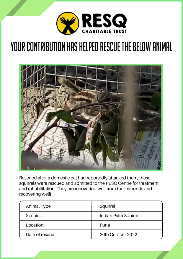 RESQ was founded in 2007 to provide emergency aid to animals in distress. Since then, the rescue and rehabilitation work of the organisation has provided aid to thousands of animals of over 200+ species, improved public health and safety outcomes, and actively worked on preventing human-animal conflict across multiple urban and rural ecosystems.