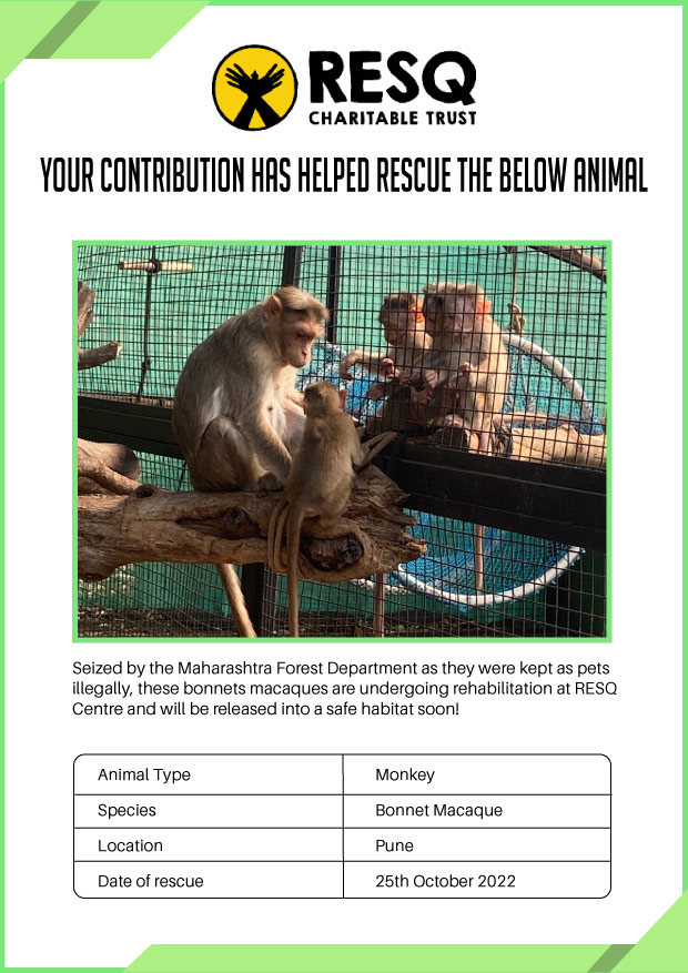 Maharashtra is home to a diverse population of wild animals, many of whom are key species identified to be globally declining. The Pune-based NGO - RESQ provides emergency aid to animals in distress. Thousands of wild animals come to RESQ annually who are either injured, sick, orphaned, or victims of wildlife trafficking and illegal captivity.