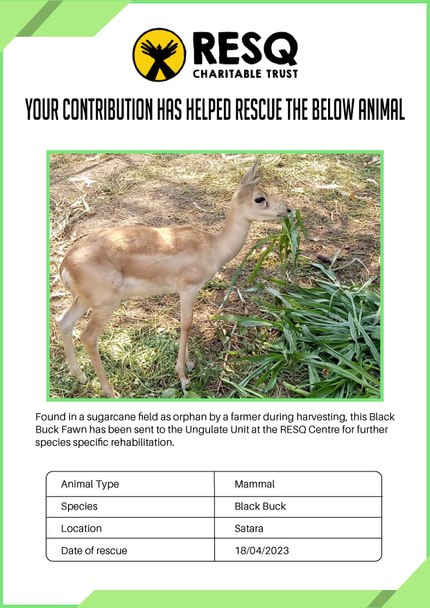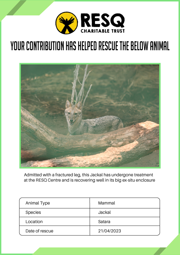 Maharashtra is home to a diverse population of wild animals, many of whom are key species identified to be globally declining. The Pune-based NGO - RESQ provides emergency aid to animals in distress. Thousands of wild animals come to RESQ annually who are either injured, sick, orphaned, or victims of wildlife trafficking and illegal captivity.