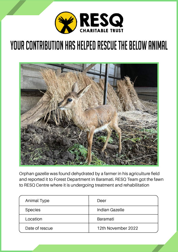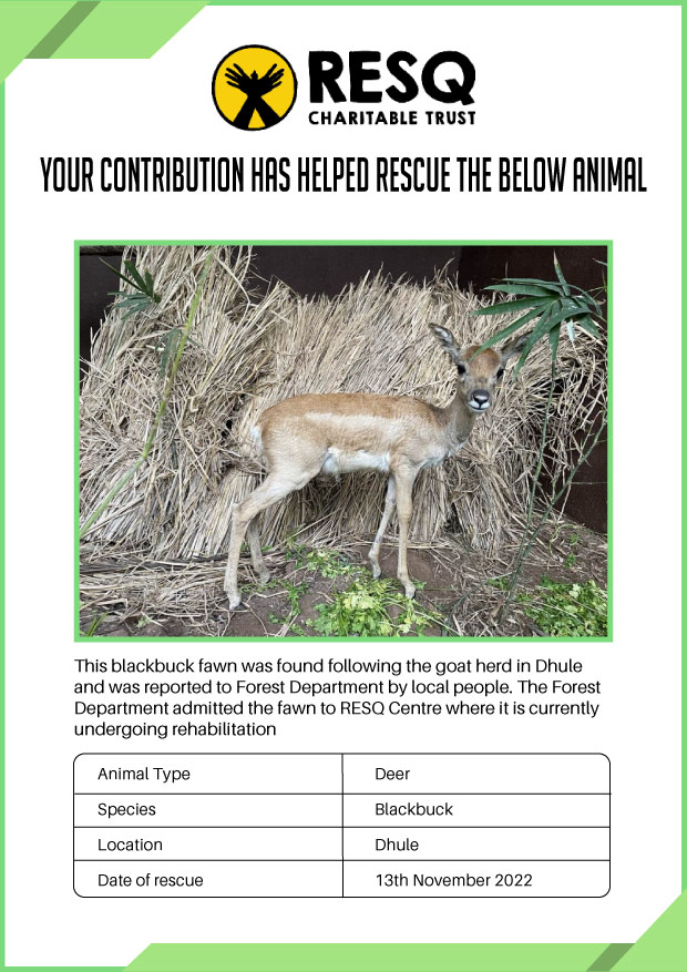 Maharashtra is home to a diverse population of wild animals, many of whom are key species identified to be globally declining. The Pune-based NGO - RESQ provides emergency aid to animals in distress. Thousands of wild animals come to RESQ annually who are either injured, sick, orphaned, or victims of wildlife trafficking and illegal captivity.
