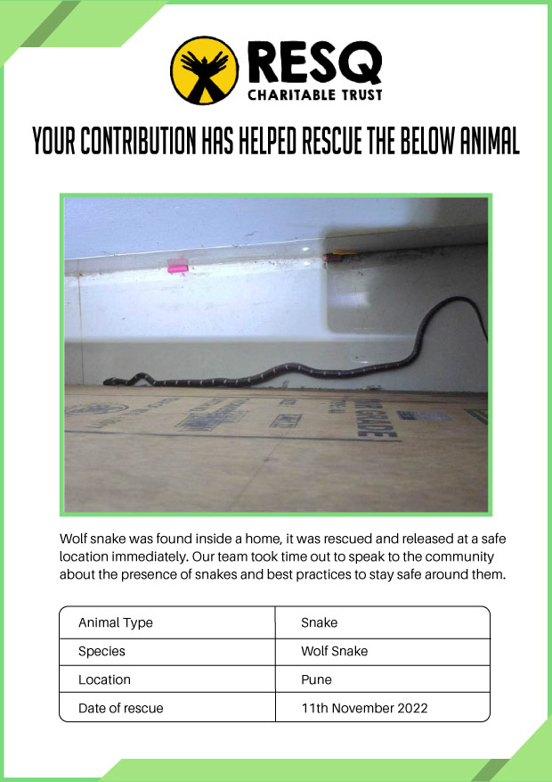 RESQ was founded in 2007 to provide emergency aid to animals in distress. Since then, the rescue and rehabilitation work of the organisation has provided aid to thousands of animals of over 200+ species, improved public health and safety outcomes, and actively worked on preventing human-animal conflict across multiple urban and rural ecosystems.