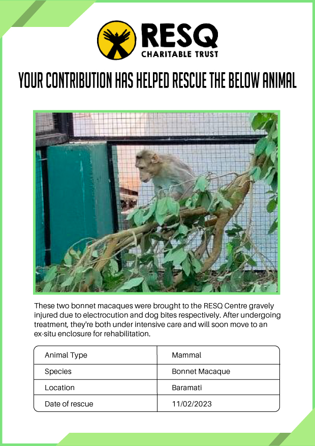 RESQ was founded in 2007 to provide emergency aid to animals in distress. Since then, the rescue and rehabilitation work of the organisation has provided aid to thousands of animals of over 200+ species, improved public health and safety outcomes, and actively worked on preventing human-animal conflict across multiple urban and rural ecosystems.