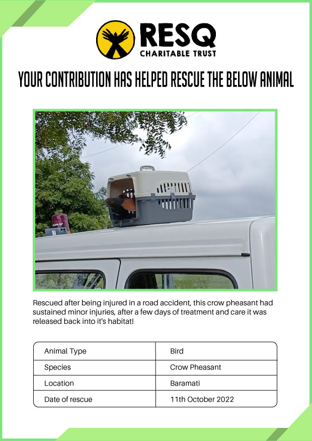 RESQ was founded in 2007 to provide emergency aid to animals in distress. Since then, the rescue and rehabilitation work of the organisation has provided aid to thousands of animals of over 200+ species, improved public health and safety outcomes, and actively worked on preventing human-animal conflict across multiple urban and rural ecosystems.