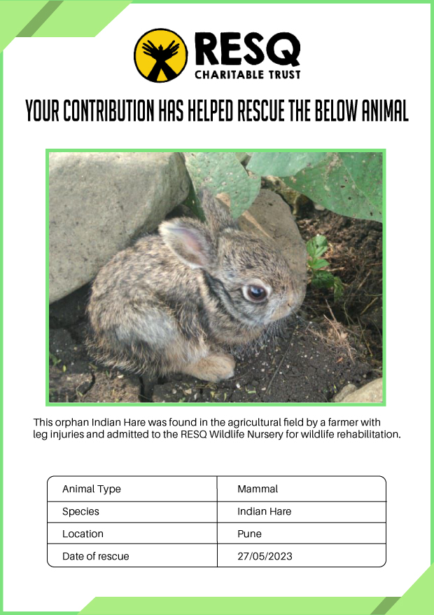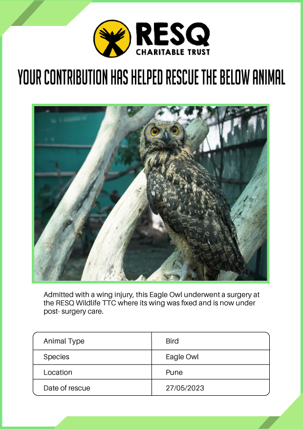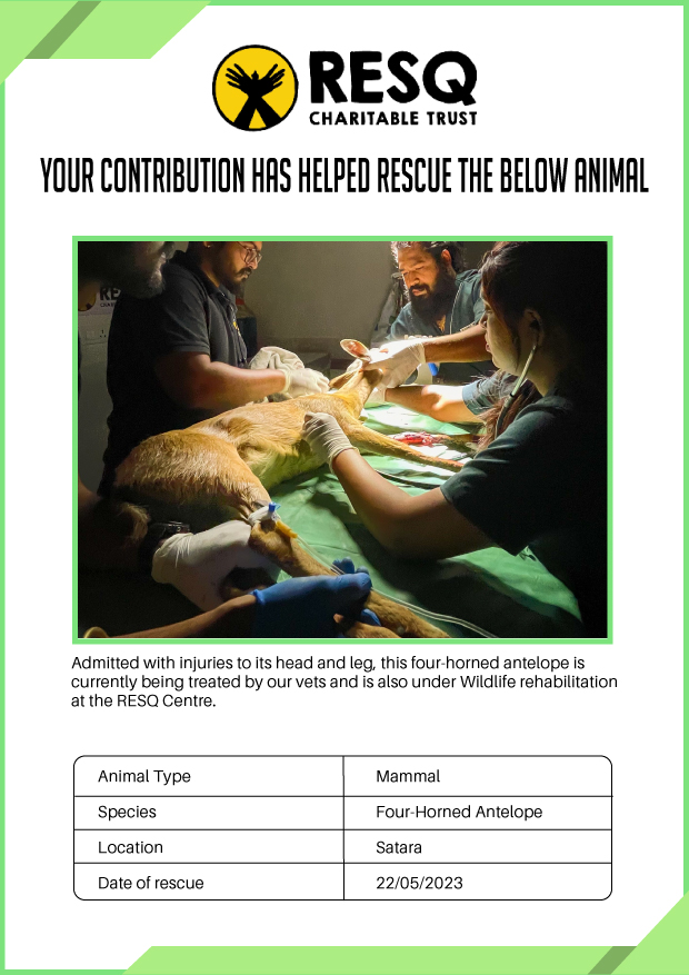 Maharashtra is home to a diverse population of wild animals, many of whom are key species identified to be globally declining. The Pune-based NGO - RESQ provides emergency aid to animals in distress. Thousands of wild animals come to RESQ annually who are either injured, sick, orphaned, or victims of wildlife trafficking and illegal captivity.