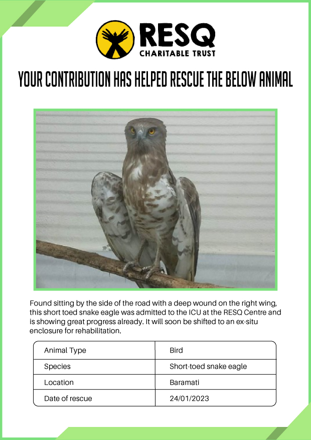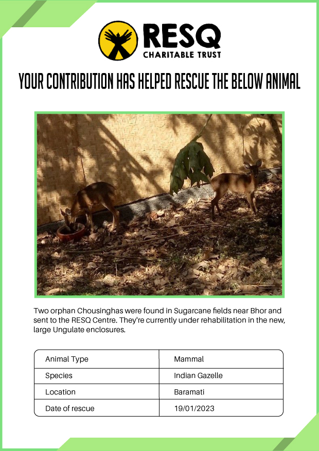 Maharashtra is home to a diverse population of wild animals, many of whom are key species identified to be globally declining. The Pune-based NGO - RESQ provides emergency aid to animals in distress. Thousands of wild animals come to RESQ annually who are either injured, sick, orphaned, or victims of wildlife trafficking and illegal captivity.