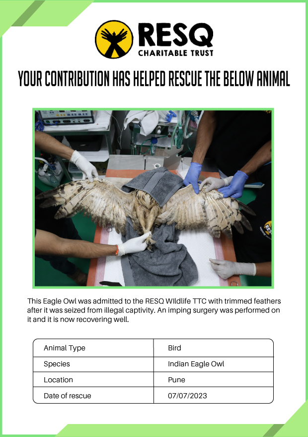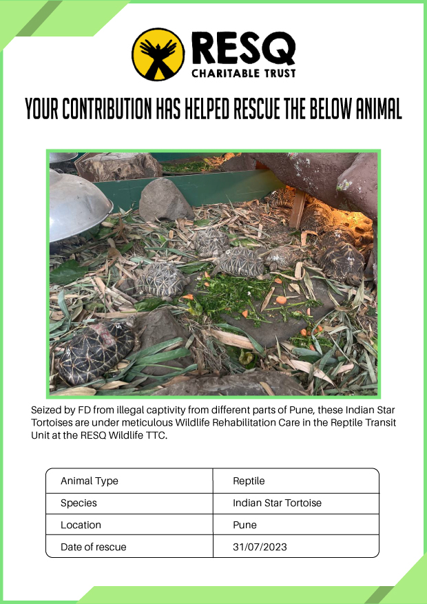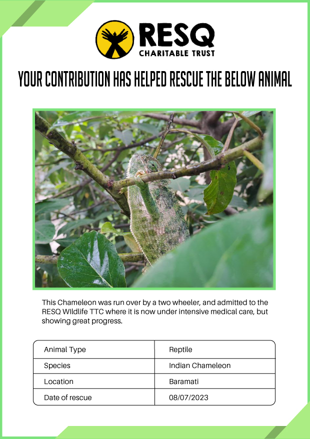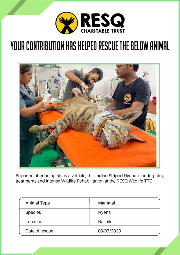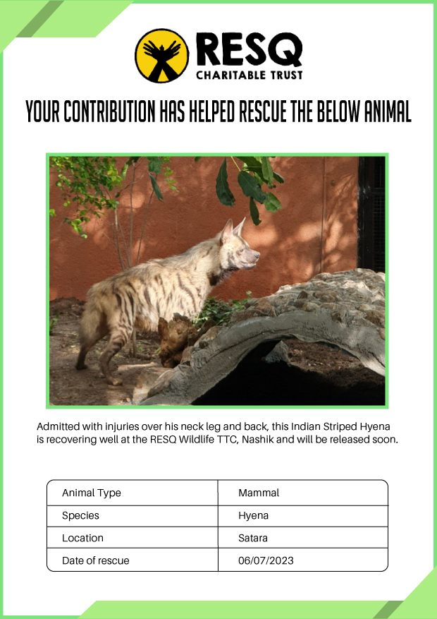 Maharashtra is home to a diverse population of wild animals, many of whom are key species identified to be globally declining. The Pune-based NGO - RESQ provides emergency aid to animals in distress. Thousands of wild animals come to RESQ annually who are either injured, sick, orphaned, or victims of wildlife trafficking and illegal captivity.