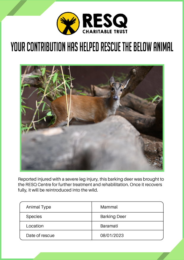 Maharashtra is home to a diverse population of wild animals, many of whom are key species identified to be globally declining. The Pune-based NGO - RESQ provides emergency aid to animals in distress. Thousands of wild animals come to RESQ annually who are either injured, sick, orphaned, or victims of wildlife trafficking and illegal captivity.
