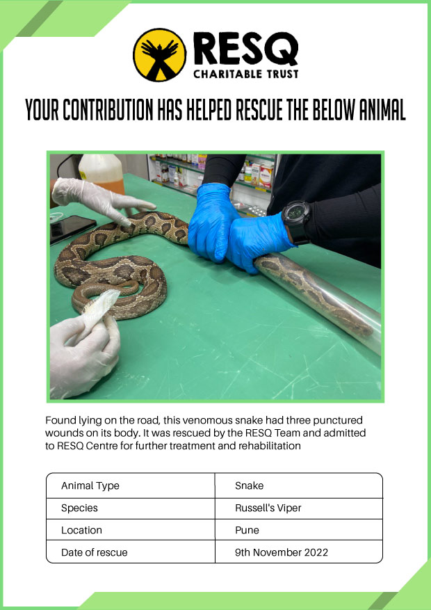 RESQ was founded in 2007 to provide emergency aid to animals in distress. Since then, the rescue and rehabilitation work of the organisation has provided aid to thousands of animals of over 200+ species, improved public health and safety outcomes, and actively worked on preventing human-animal conflict across multiple urban and rural ecosystems.