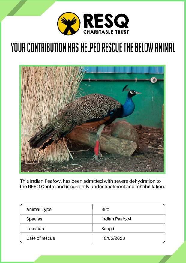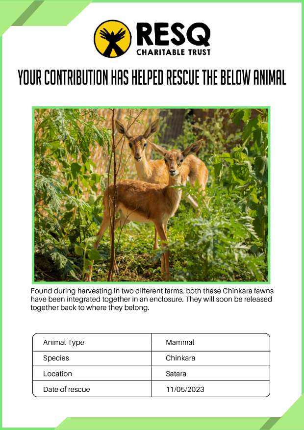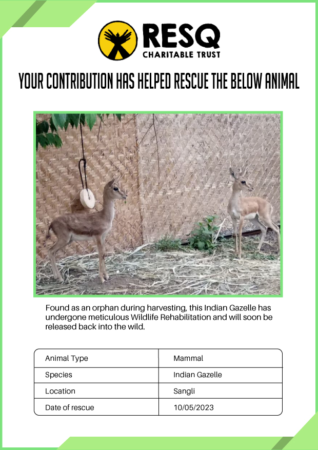 Maharashtra is home to a diverse population of wild animals, many of whom are key species identified to be globally declining. The Pune-based NGO - RESQ provides emergency aid to animals in distress. Thousands of wild animals come to RESQ annually who are either injured, sick, orphaned, or victims of wildlife trafficking and illegal captivity.