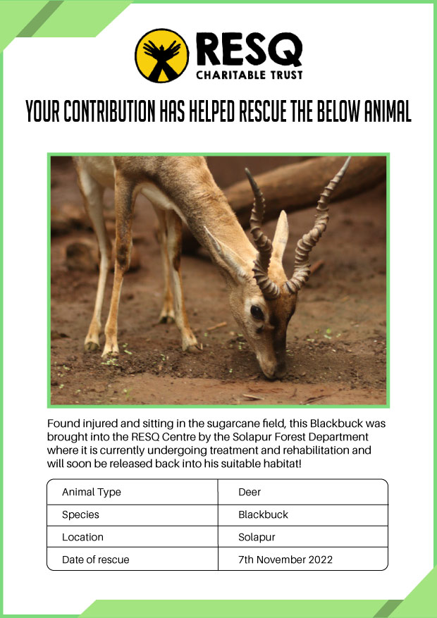 Maharashtra is home to a diverse population of wild animals, many of whom are key species identified to be globally declining. The Pune-based NGO - RESQ provides emergency aid to animals in distress. Thousands of wild animals come to RESQ annually who are either injured, sick, orphaned, or victims of wildlife trafficking and illegal captivity.