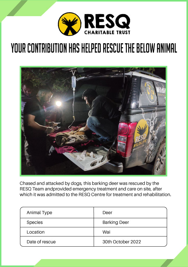 Maharashtra is home to a diverse population of wild animals, many of whom are key species identified to be globally declining. The Pune-based NGO - RESQ provides emergency aid to animals in distress. Thousands of wild animals come to RESQ annually who are either injured, sick, orphaned, or victims of wildlife trafficking and illegal captivity.