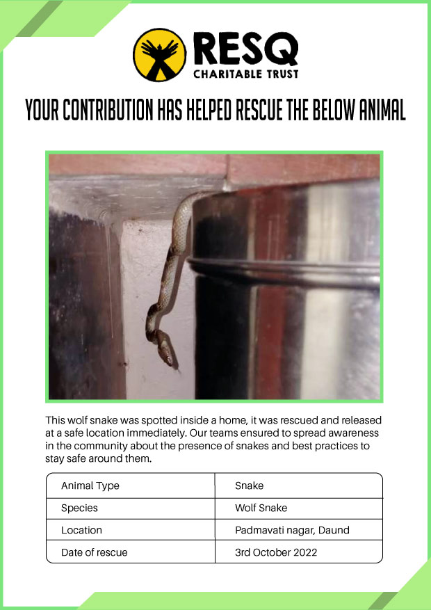 RESQ was founded in 2007 to provide emergency aid to animals in distress. Since then, the rescue and rehabilitation work of the organisation has provided aid to thousands of animals of over 200+ species, improved public health and safety outcomes, and actively worked on preventing human-animal conflict across multiple urban and rural ecosystems.