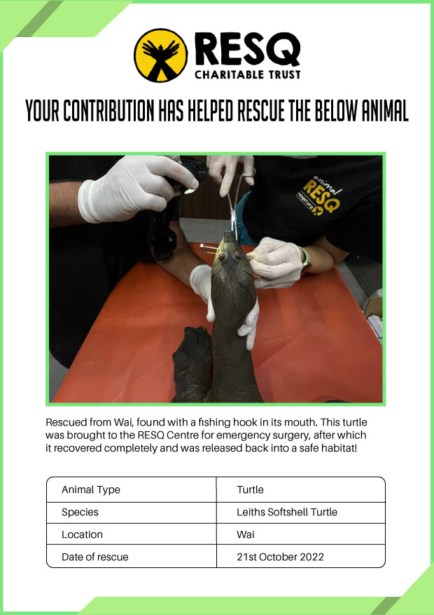 RESQ was founded in 2007 to provide emergency aid to animals in distress. Since then, the rescue and rehabilitation work of the organisation has provided aid to thousands of animals of over 200+ species, improved public health and safety outcomes, and actively worked on preventing human-animal conflict across multiple urban and rural ecosystems.