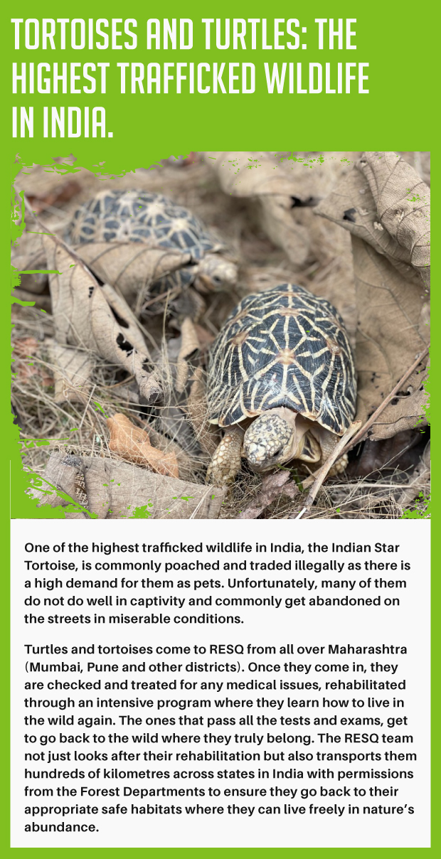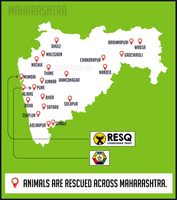Maharashtra is home to a diverse population of wild animals, many of whom are key species identified to be globally declining. The Pune-based NGO - RESQ provides emergency aid to animals in distress. Thousands of wild animals come to RESQ annually who are either injured, sick, orphaned, or victims of wildlife trafficking and illegal captivity.