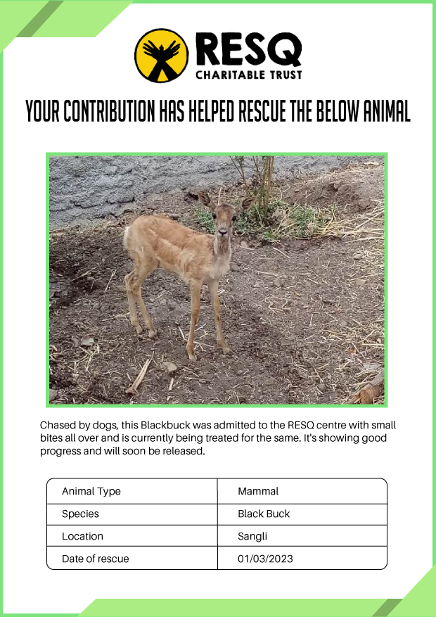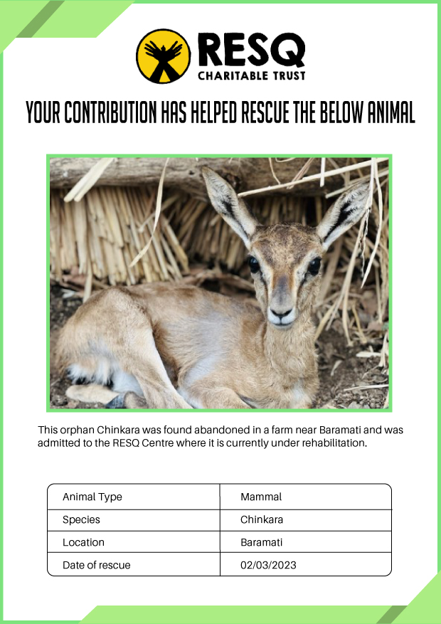 Maharashtra is home to a diverse population of wild animals, many of whom are key species identified to be globally declining. The Pune-based NGO - RESQ provides emergency aid to animals in distress. Thousands of wild animals come to RESQ annually who are either injured, sick, orphaned, or victims of wildlife trafficking and illegal captivity.