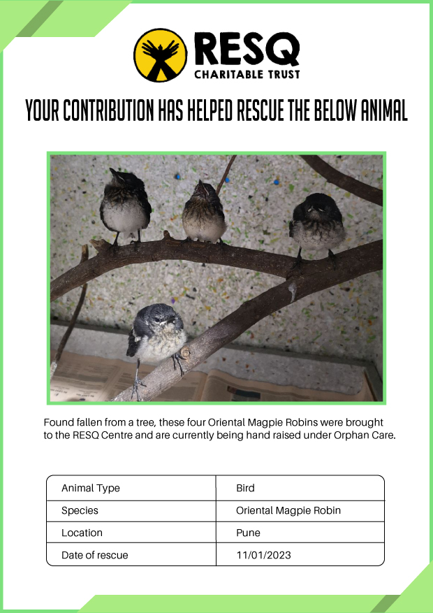 RESQ was founded in 2007 to provide emergency aid to animals in distress. Since then, the rescue and rehabilitation work of the organisation has provided aid to thousands of animals of over 200+ species, improved public health and safety outcomes, and actively worked on preventing human-animal conflict across multiple urban and rural ecosystems.