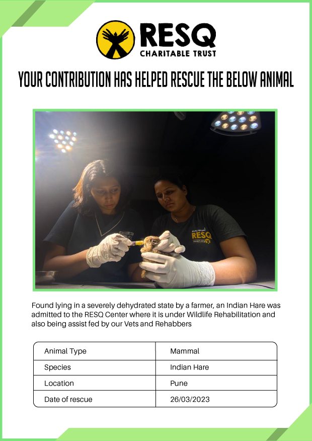 Maharashtra is home to a diverse population of wild animals, many of whom are key species identified to be globally declining. The Pune-based NGO - RESQ provides emergency aid to animals in distress. Thousands of wild animals come to RESQ annually who are either injured, sick, orphaned, or victims of wildlife trafficking and illegal captivity.