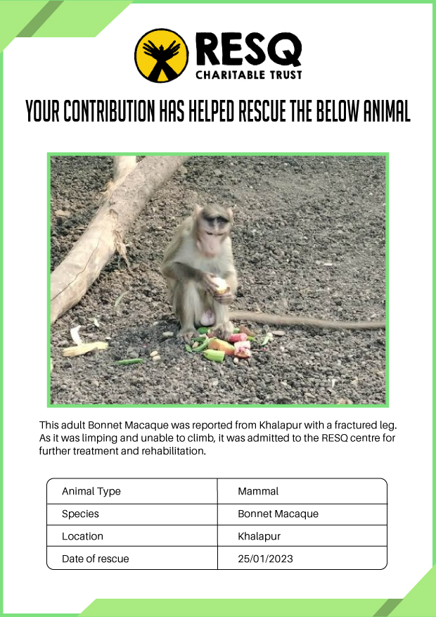 Maharashtra is home to a diverse population of wild animals, many of whom are key species identified to be globally declining. The Pune-based NGO - RESQ provides emergency aid to animals in distress. Thousands of wild animals come to RESQ annually who are either injured, sick, orphaned, or victims of wildlife trafficking and illegal captivity.