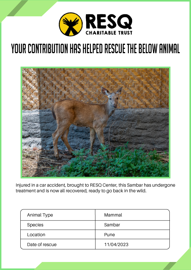 Maharashtra is home to a diverse population of wild animals, many of whom are key species identified to be globally declining. The Pune-based NGO - RESQ provides emergency aid to animals in distress. Thousands of wild animals come to RESQ annually who are either injured, sick, orphaned, or victims of wildlife trafficking and illegal captivity.