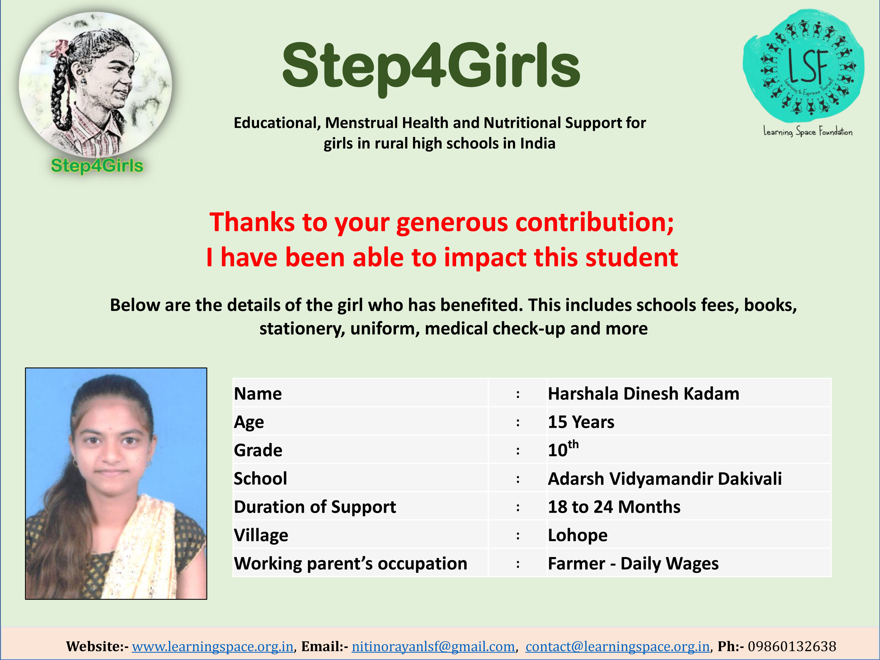 To ensure that there is complete transparency, the team at Learning Space Foundation will post feedback about 2-3 months after the campaign gets over telling us which student benefitted from the funding. The details will then be posted on the UPDATES section of my campaign and will be in a format like the one below. Once the update is posted the platform will send an EMAIL alert to you. Click on the link and you can read about which child has benefitted. That's transparent right.