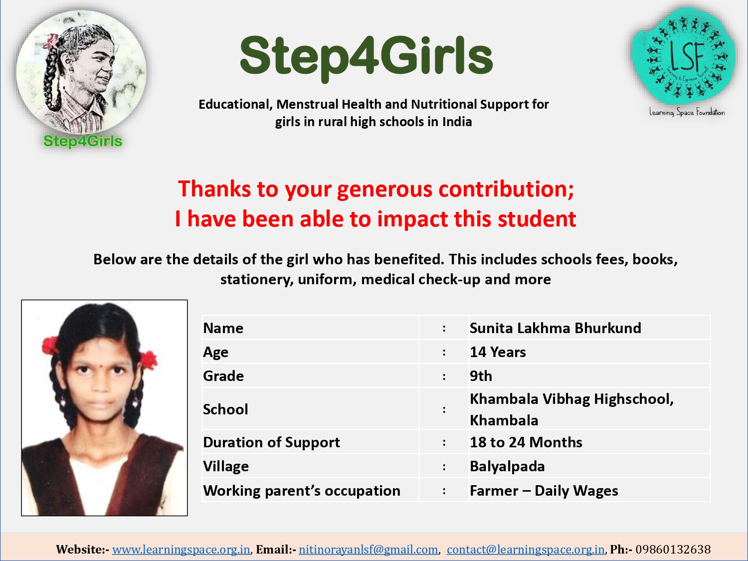 To ensure that there is complete transparency, the team at Learning Space Foundation will post feedback about 2-3 months after the campaign gets over telling us which student benefitted from the funding. The details will then be posted on the UPDATES section of my campaign and will be in a format like the one below. Once the update is posted the platform will send an EMAIL alert to you. Click on the link and you can read about which child has benefitted. That's transparent right.