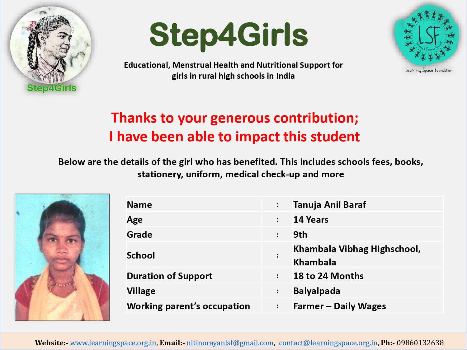 I was thrilled to learn about this initiative that provides education to underprivileged girls in Palghar and Thane districts. This will help them continue their education and achieve their dreams. Just INR 12000 will support their education for an entire year.