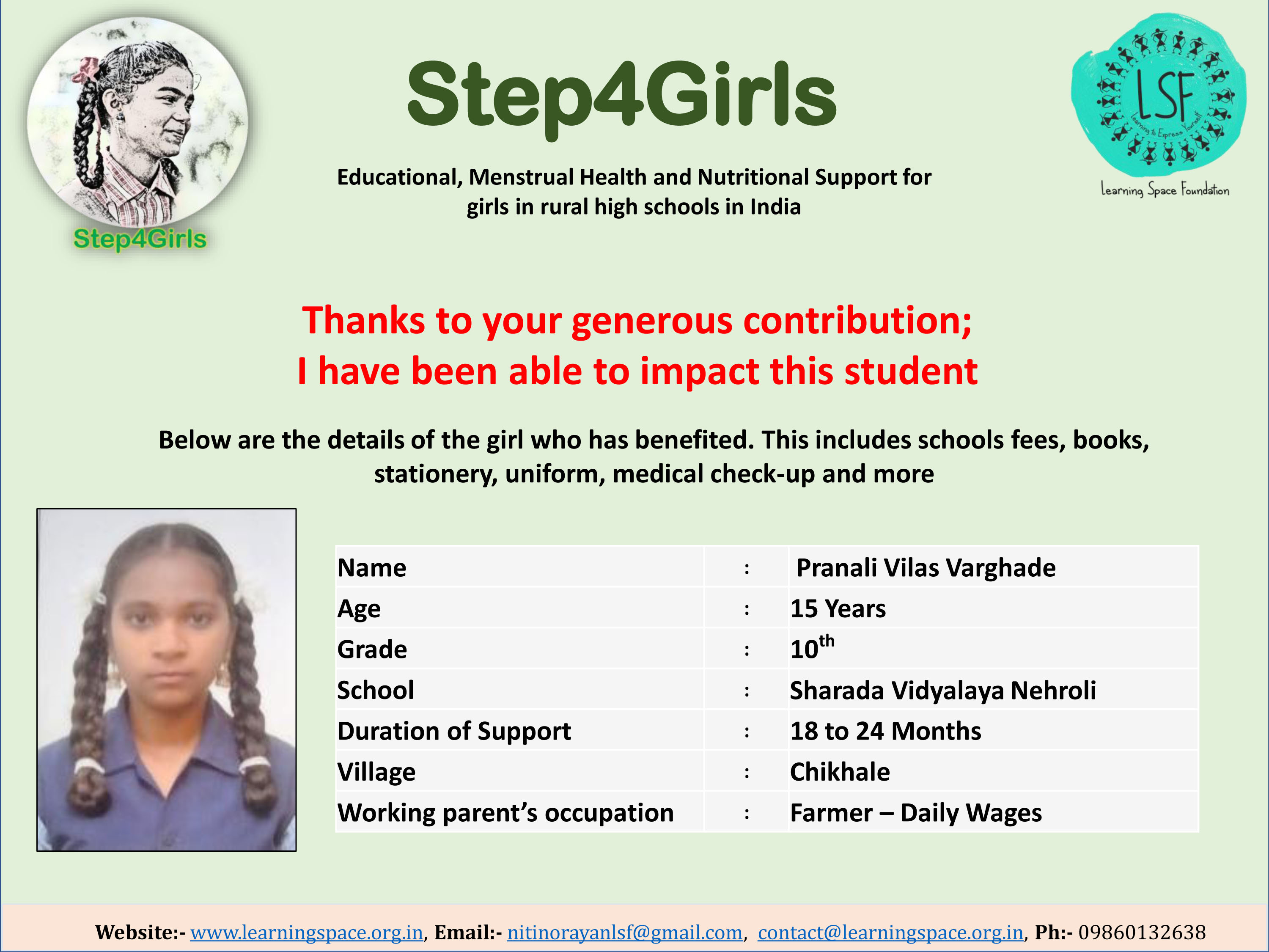 I was thrilled to learn about this initiative that provides education to underprivileged girls in Palghar and Thane districts. This will help them continue their education and achieve their dreams. Just INR 12000 will support their education for an entire year.