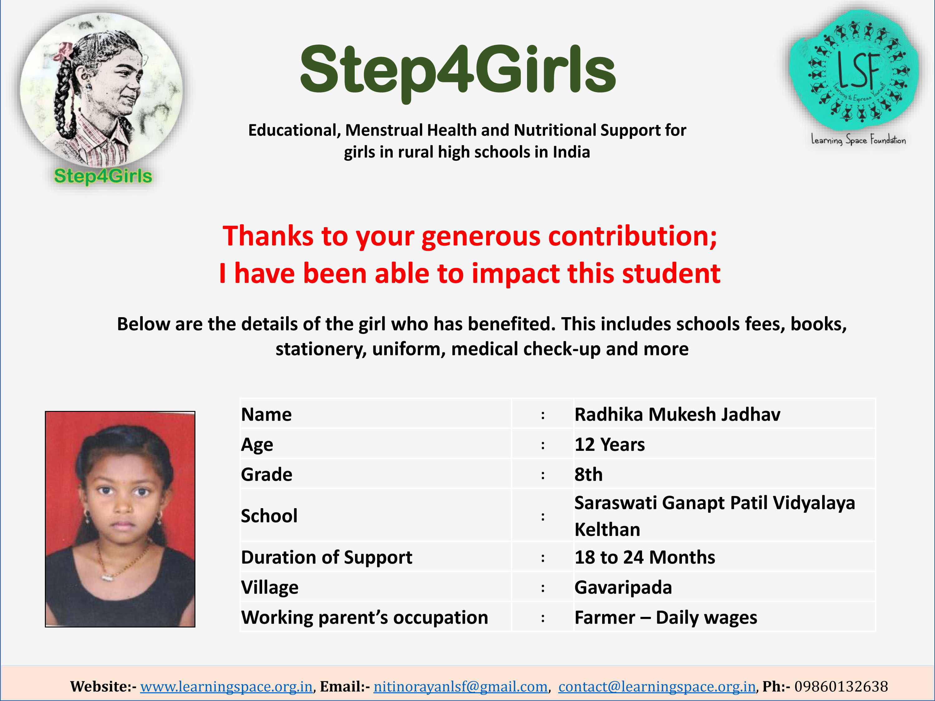 I was thrilled to learn about this initiative that provides education to underprivileged girls in Palghar and Thane districts. This will help them continue their education and achieve their dreams. Just INR 12000 will support their education for an entire year.