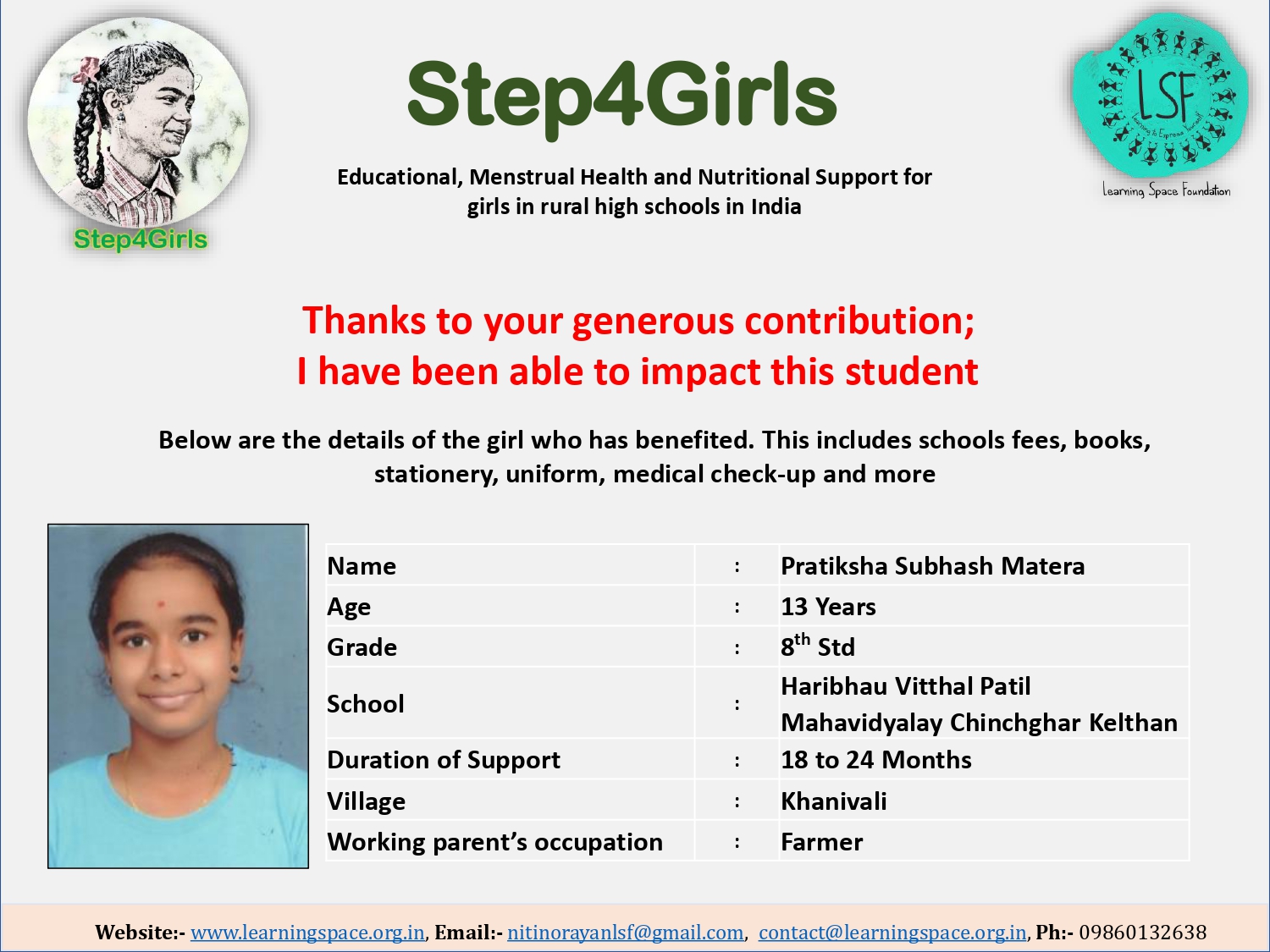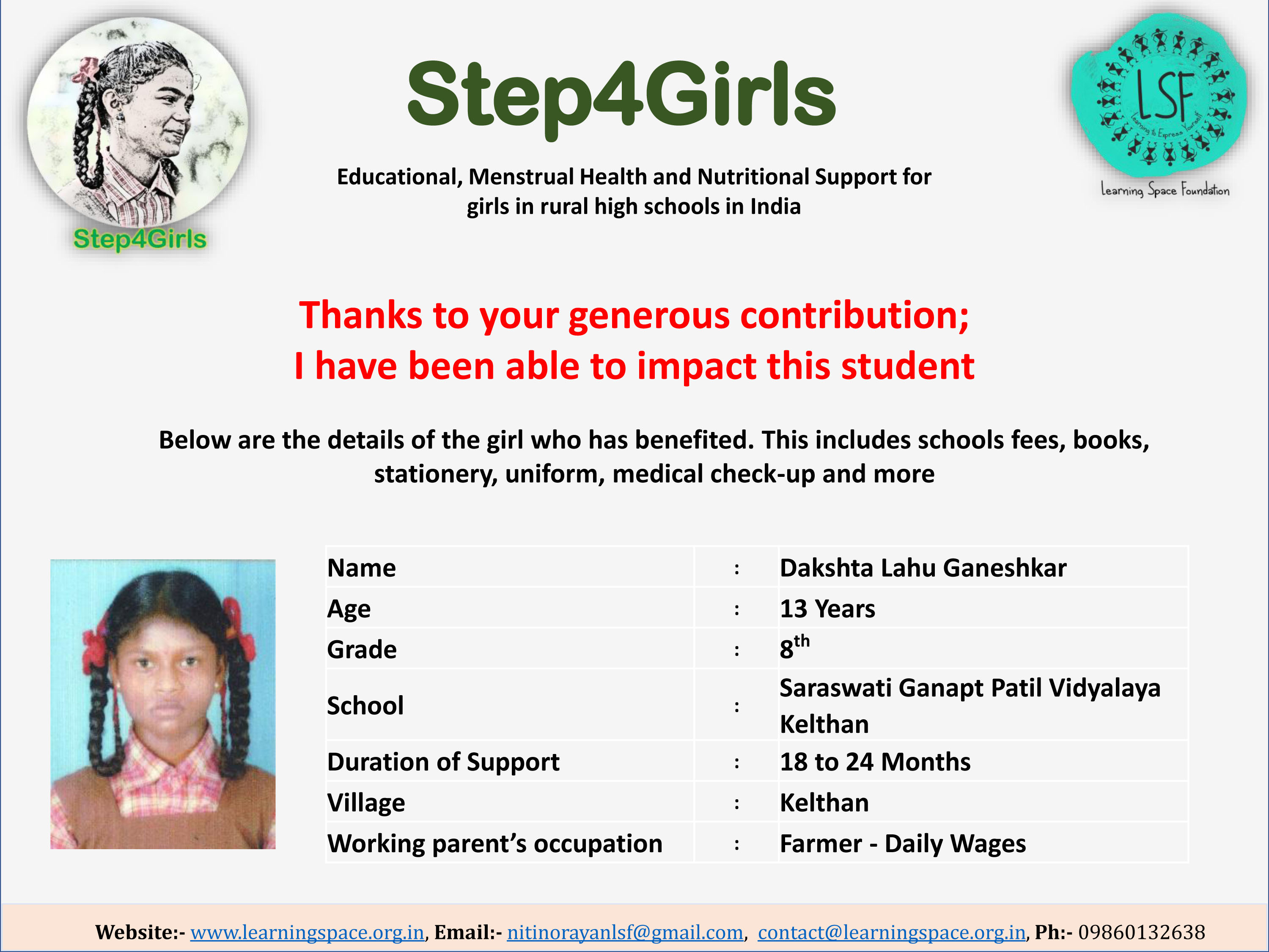 To ensure that there is complete transparency, the team at Learning Space Foundation will post feedback about 2-3 months after the campaign gets over telling us which student benefitted from the funding. The details will then be posted on the UPDATES section of my campaign and will be in a format like the one below. Once the update is posted the platform will send an EMAIL alert to you. Click on the link and you can read about which child has benefitted. That's transparent right.