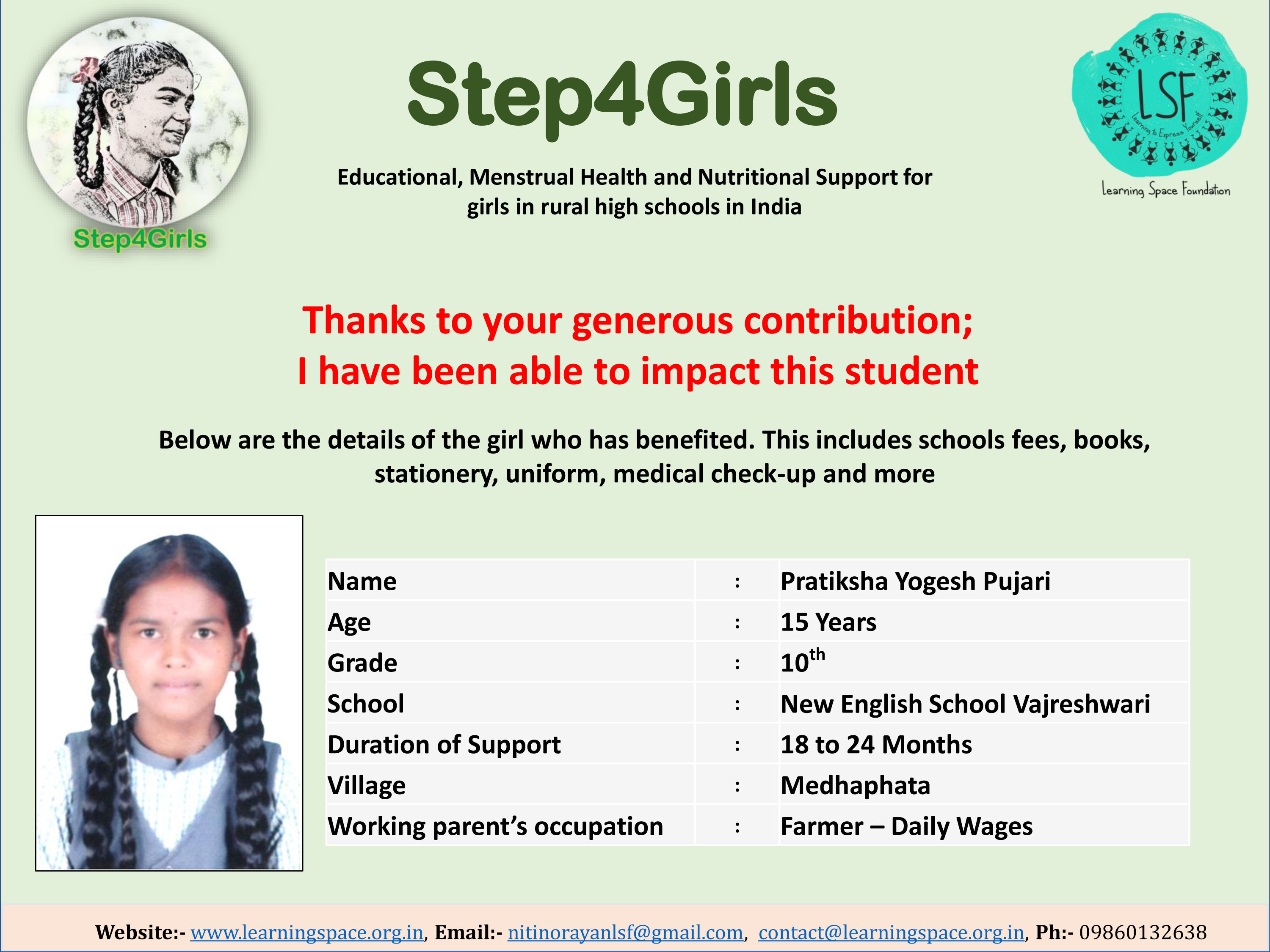 I was thrilled to learn about this initiative that provides education to underprivileged girls in Palghar and Thane districts. This will help them continue their education and achieve their dreams. Just INR 12000 will support their education for an entire year.