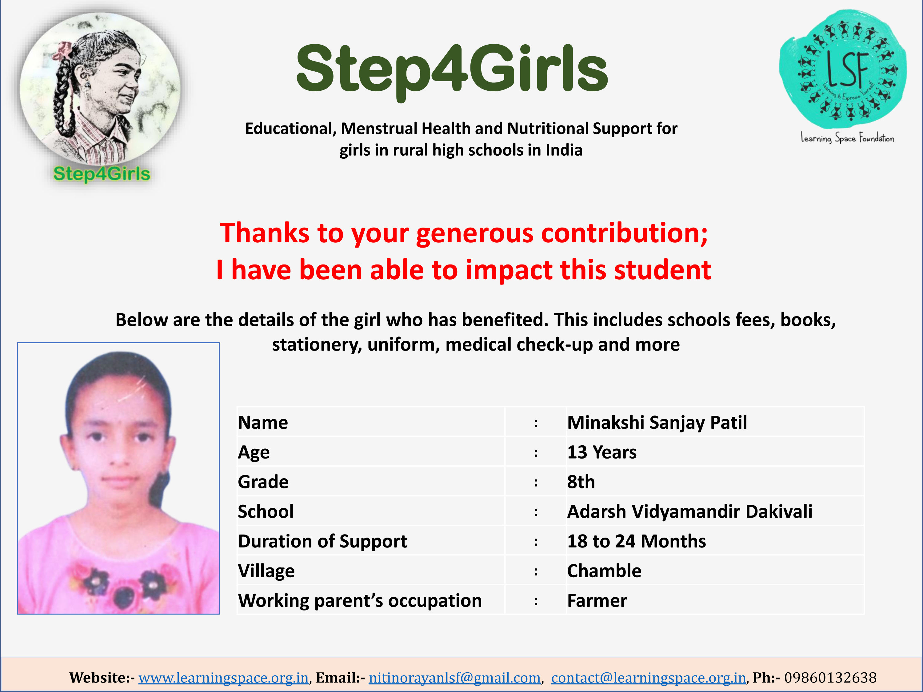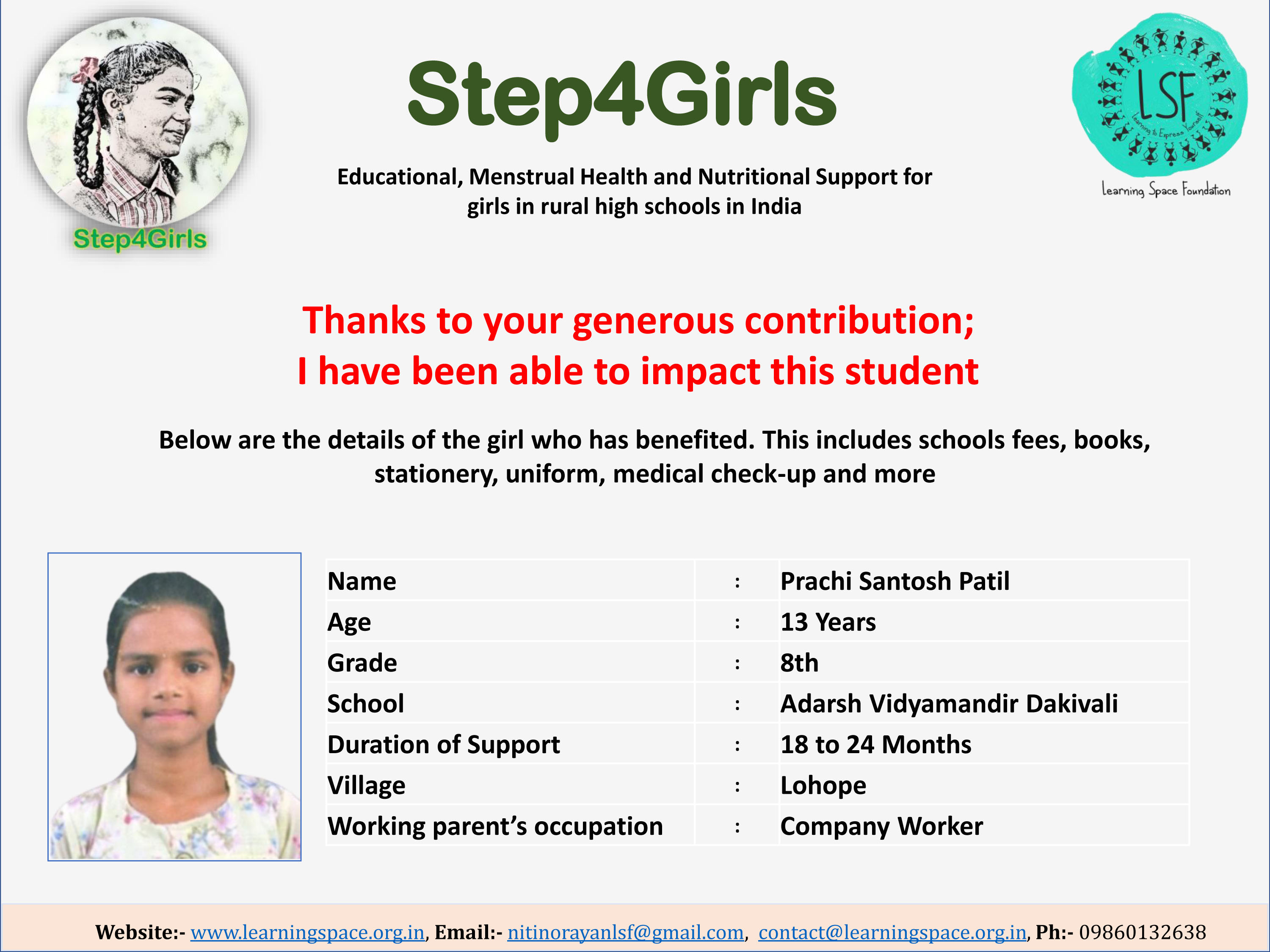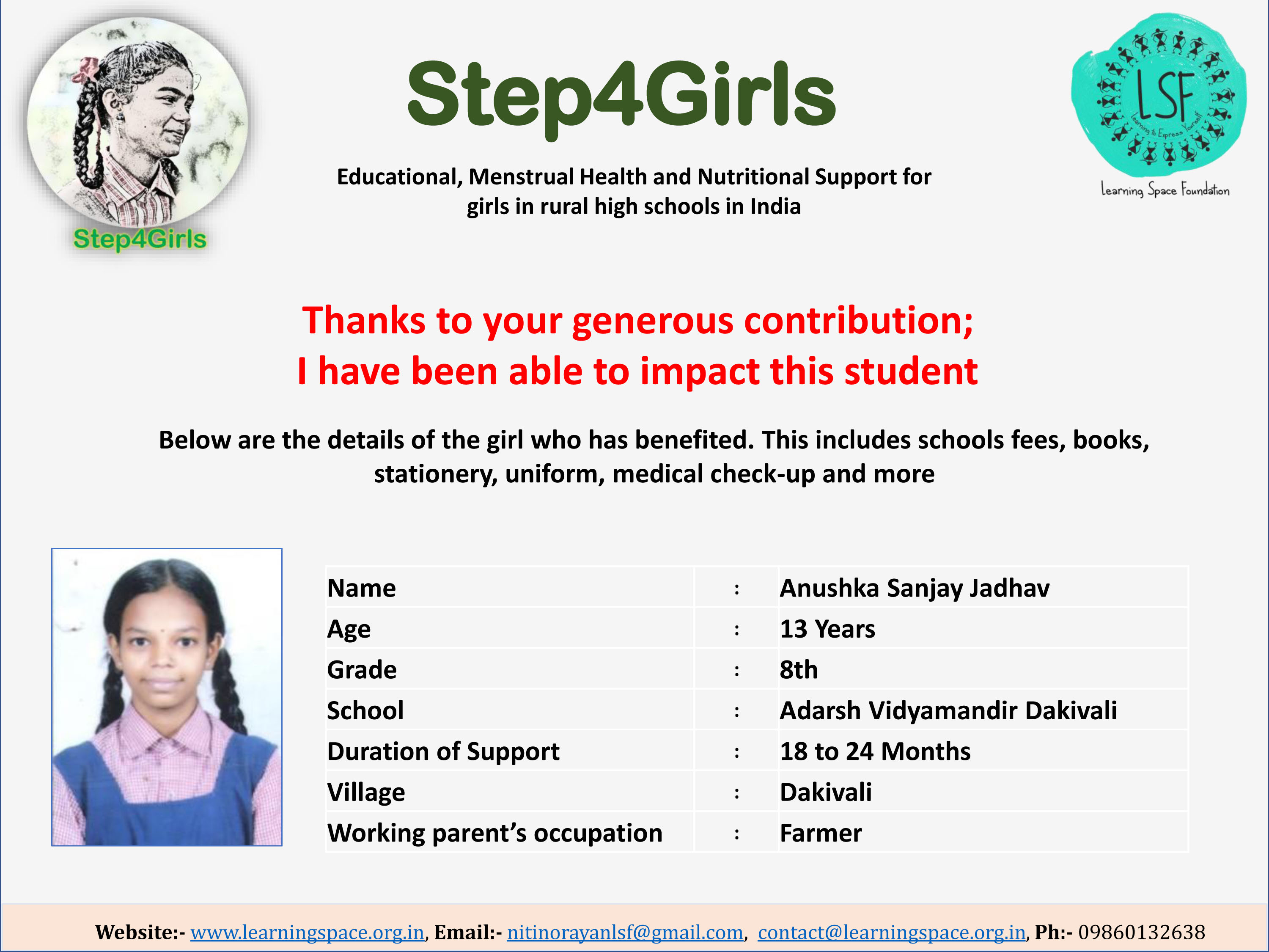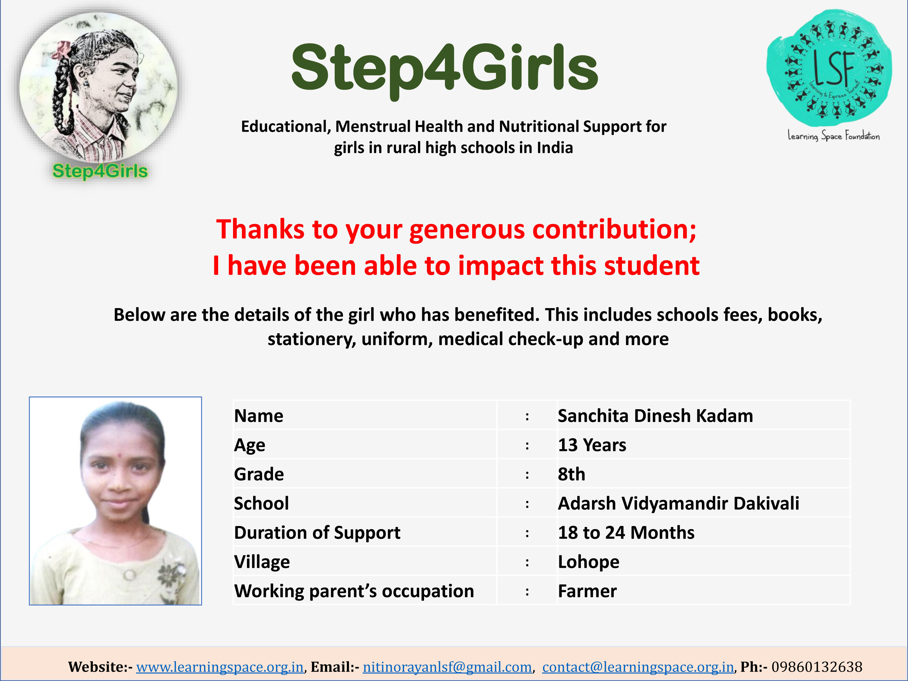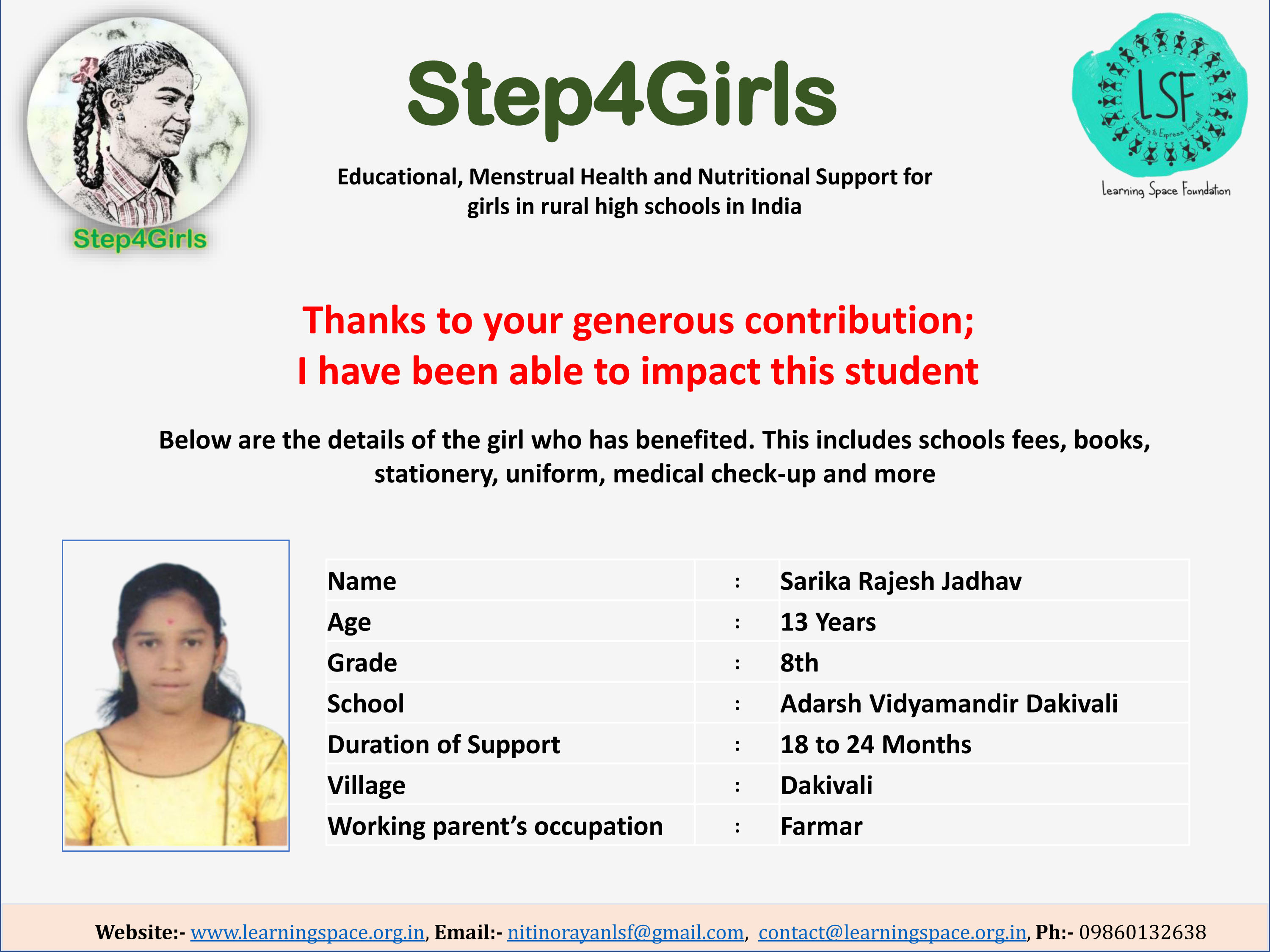 To ensure that there is complete transparency, the team at Learning Space Foundation will post feedback about 2-3 months after the campaign gets over telling us which student benefitted from the funding. The details will then be posted on the UPDATES section of my campaign and will be in a format like the one below. Once the update is posted the platform will send an EMAIL alert to you. Click on the link and you can read about which child has benefitted. That's transparent right.