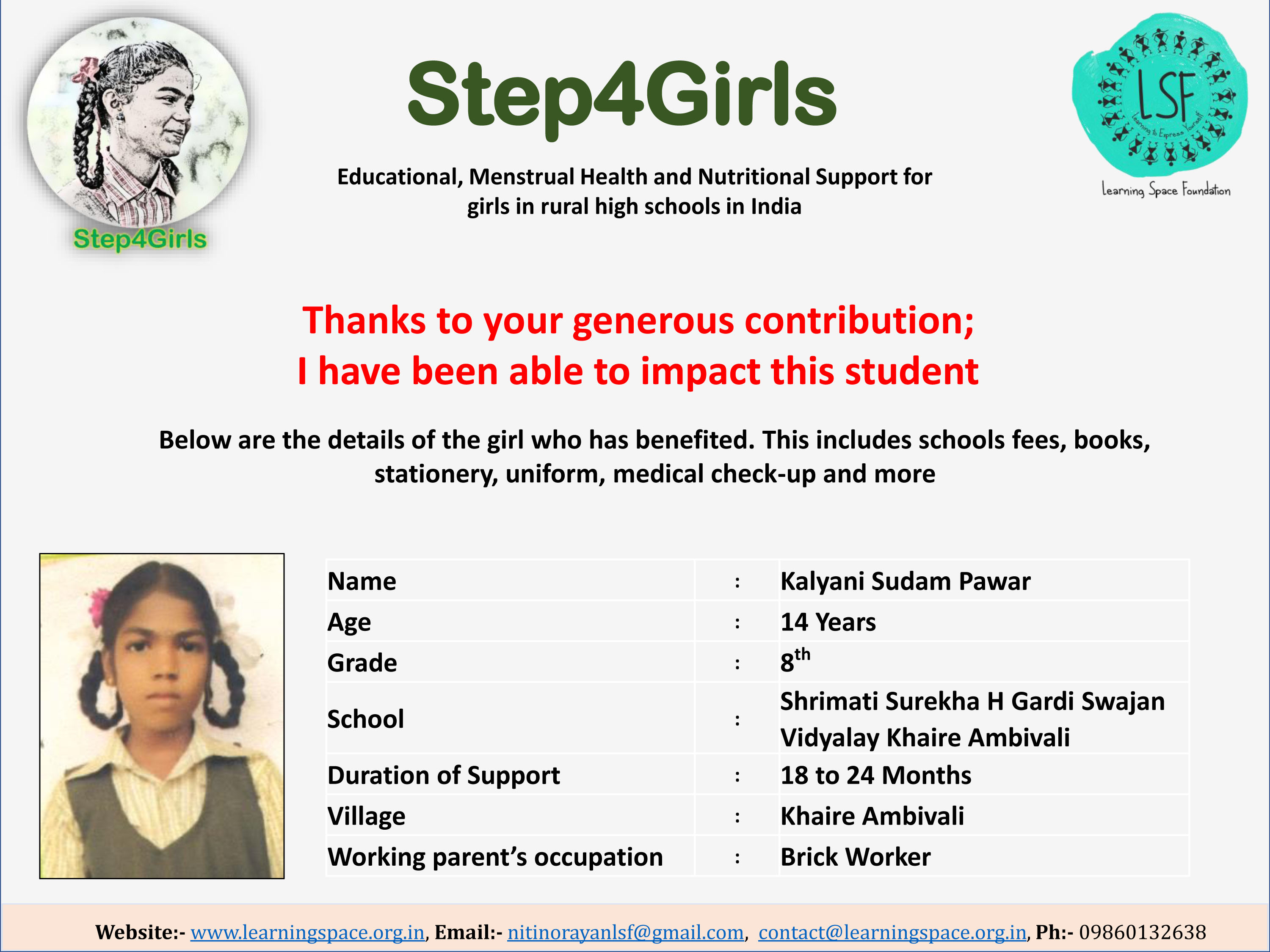 This wonderful initiative will provide education to those underprivileged girls of Palghar and Thane districts whose families can not afford it. This will help them continue to achieve their dreams and help them build a better future for themselves. Just INR 12,000 will help us support their education for an entire year.