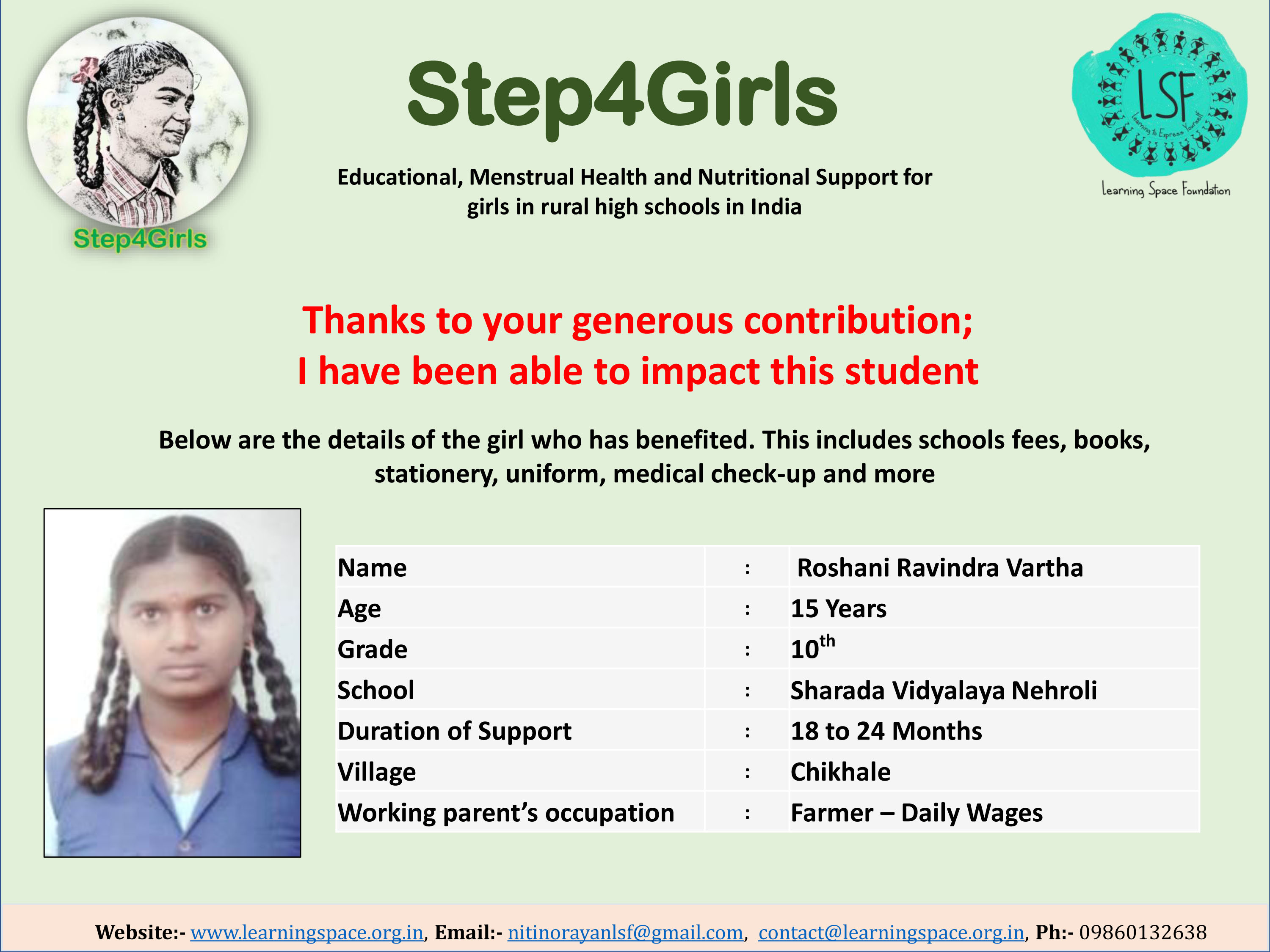 I was thrilled to learn about this initiative that provides education to underprivileged girls in Palghar and Thane districts. This will help them continue their education and achieve their dreams. Just INR 12000 will support their education for an entire year.