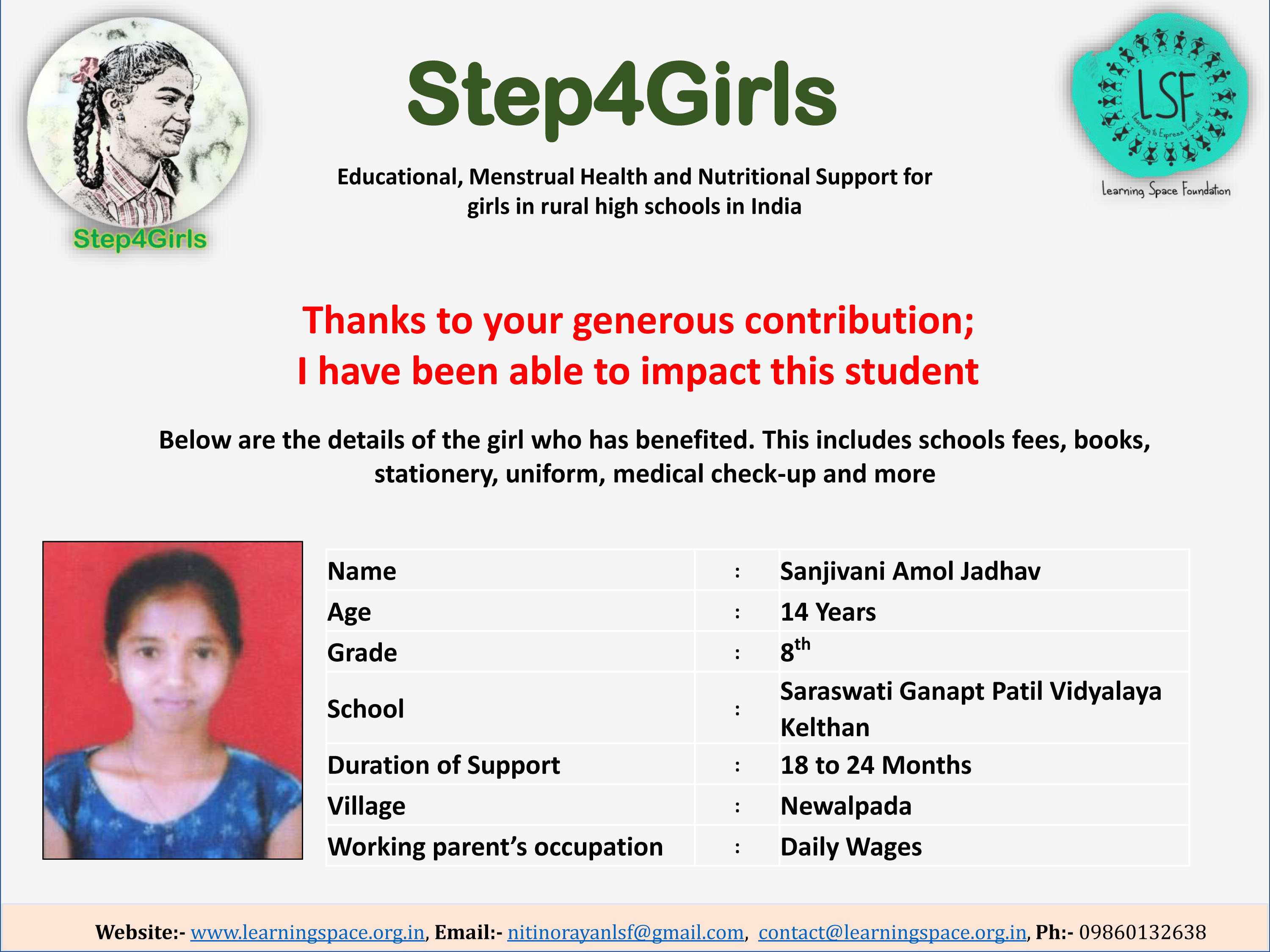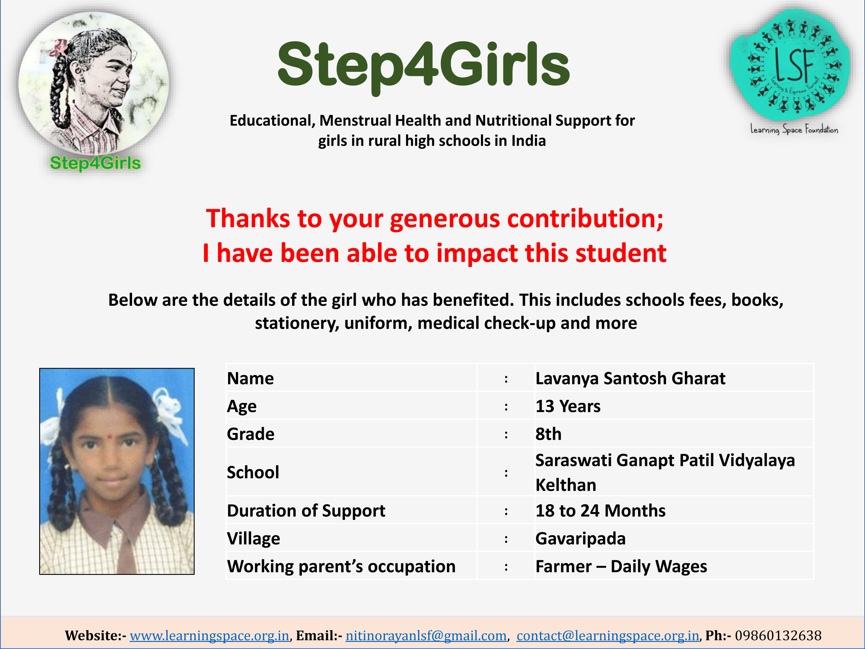 To ensure that there is complete transparency, the team at Learning Space Foundation will post feedback about 2-3 months after the campaign gets over telling us which student benefitted from the funding. The details will then be posted on the UPDATES section of my campaign and will be in a format like the one below. Once the update is posted the platform will send an EMAIL alert to you. Click on the link and you can read about which child has benefitted. That's transparent right.