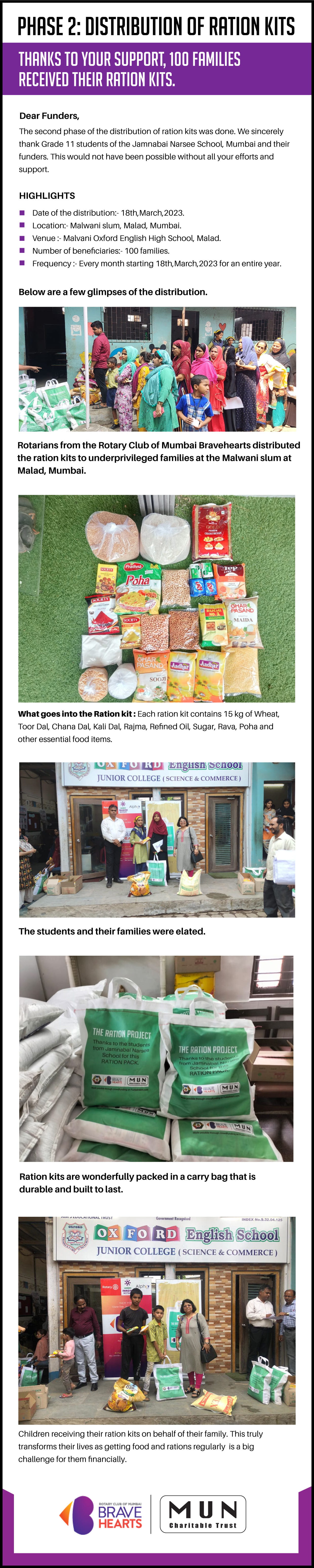 The Rotary Club of Mumbai BraveHearts (RCMBH) is an association of eclectic individuals. Chartered on July 2, 2020, the members of RCMBH genuinely believe in having the courage to follow their collective beliefs. Ergo, they indeed are 'Bravehearts'. Our 55 members come from all walks of life. We have a wide range of projects, like pediatric heart surgeries, affordable housing, and prevention of sexual harassment have already made a massive impact. This initiative to support children and their families with Ration Kits is a critical project for us.