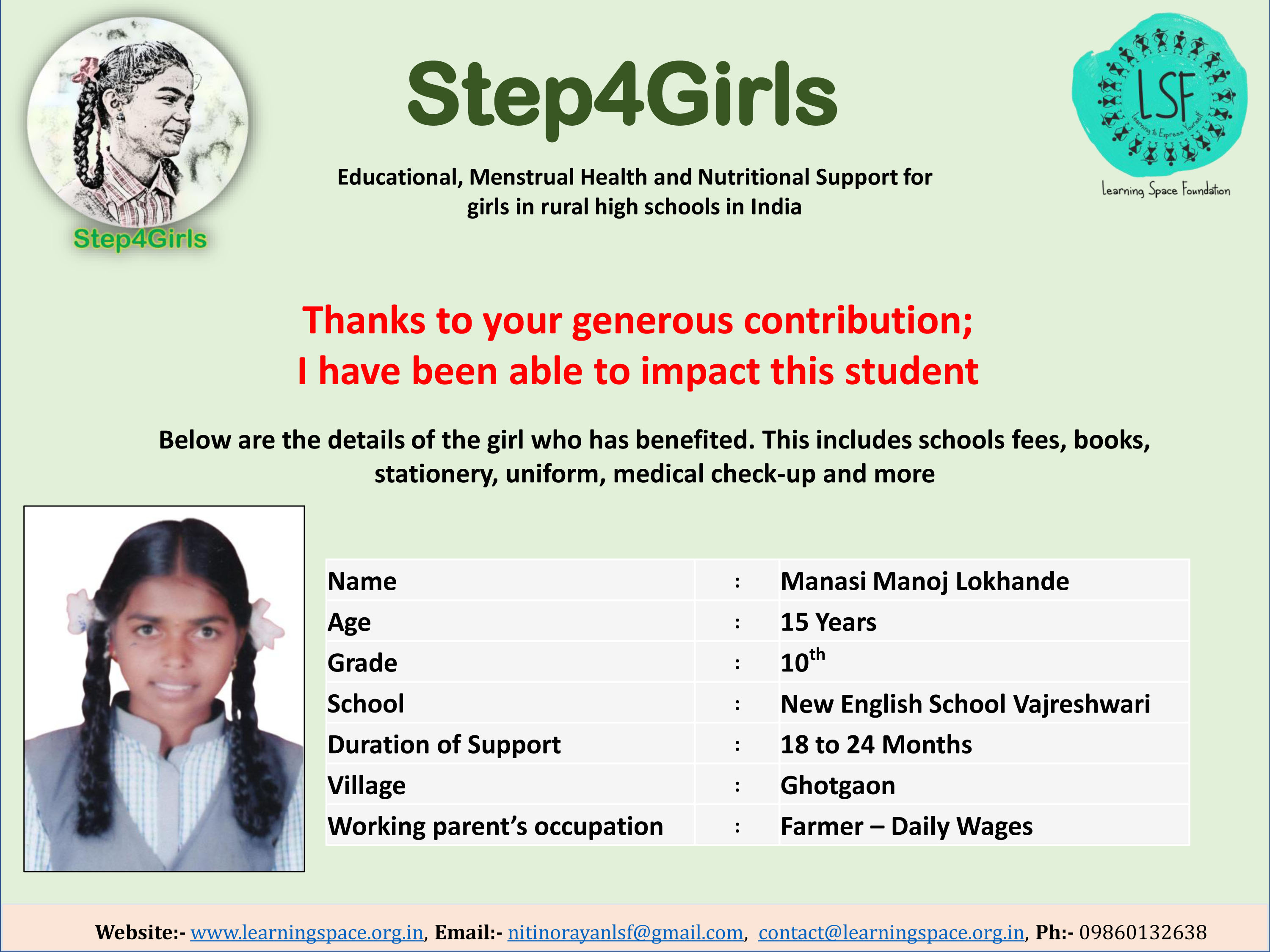 I was thrilled to learn about this initiative that provides education to underprivileged girls in Palghar and Thane districts. This will help them continue their education and achieve their dreams. Just INR 12000 will support their education for an entire year.