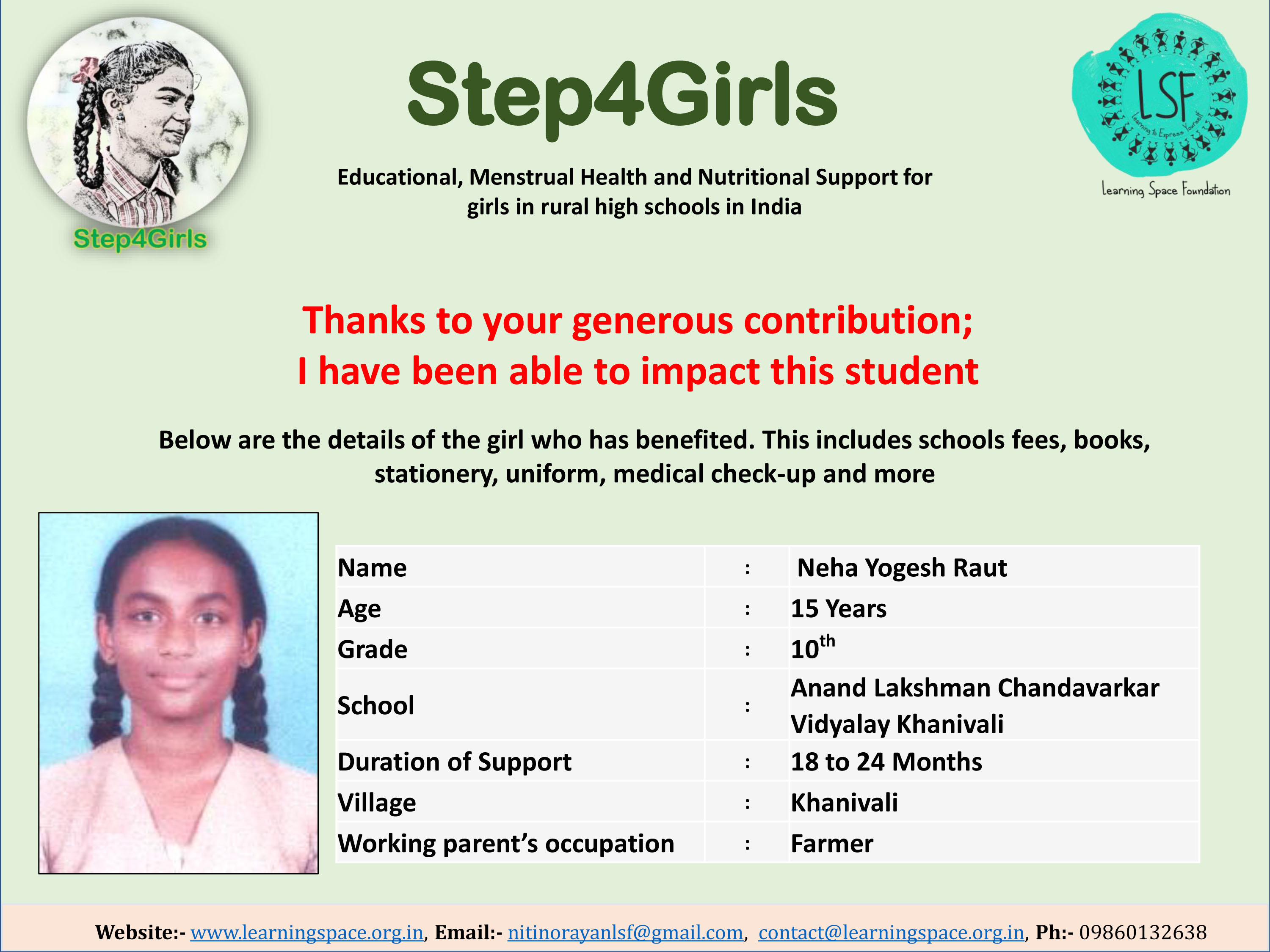I was thrilled to learn about this initiative that provides education to underprivileged girls in Palghar and Thane districts. This will help them continue their education and achieve their dreams. Just INR 12000 will support their education for an entire year.
