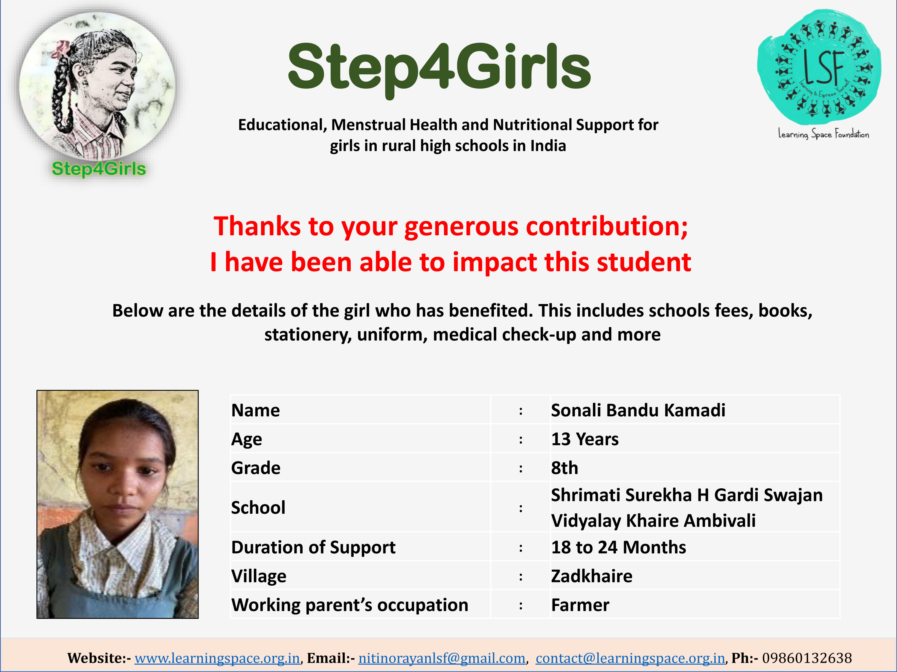 I was thrilled to learn about this initiative that provides education to underprivileged girls in Palghar and Thane districts. This will help them continue their education and achieve their dreams. Just INR 12000 will support their education for an entire year.