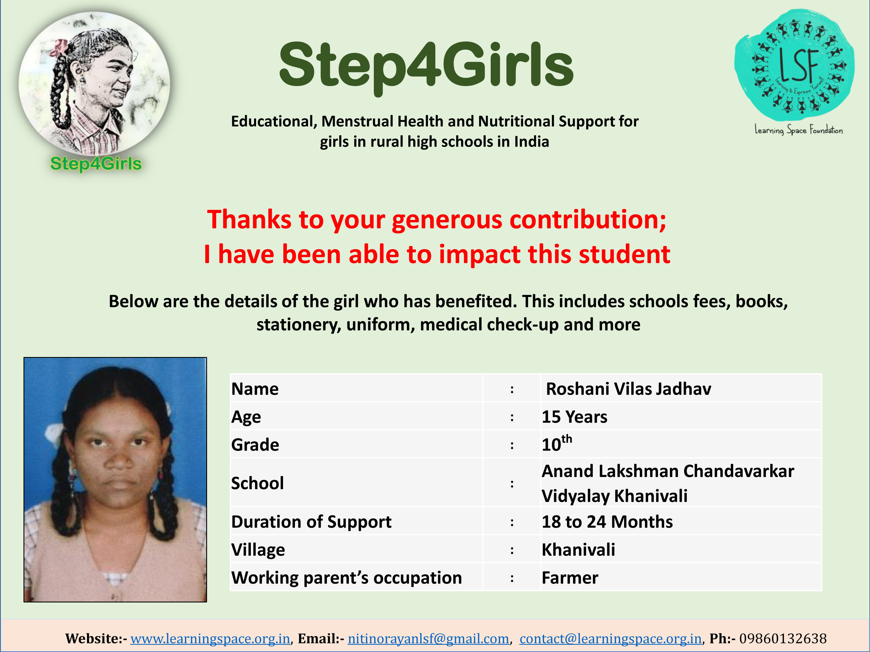I was thrilled to learn about this initiative that provides education to underprivileged girls in Palghar and Thane districts. This will help them continue their education and achieve their dreams. Just INR 12000 will support their education for an entire year.