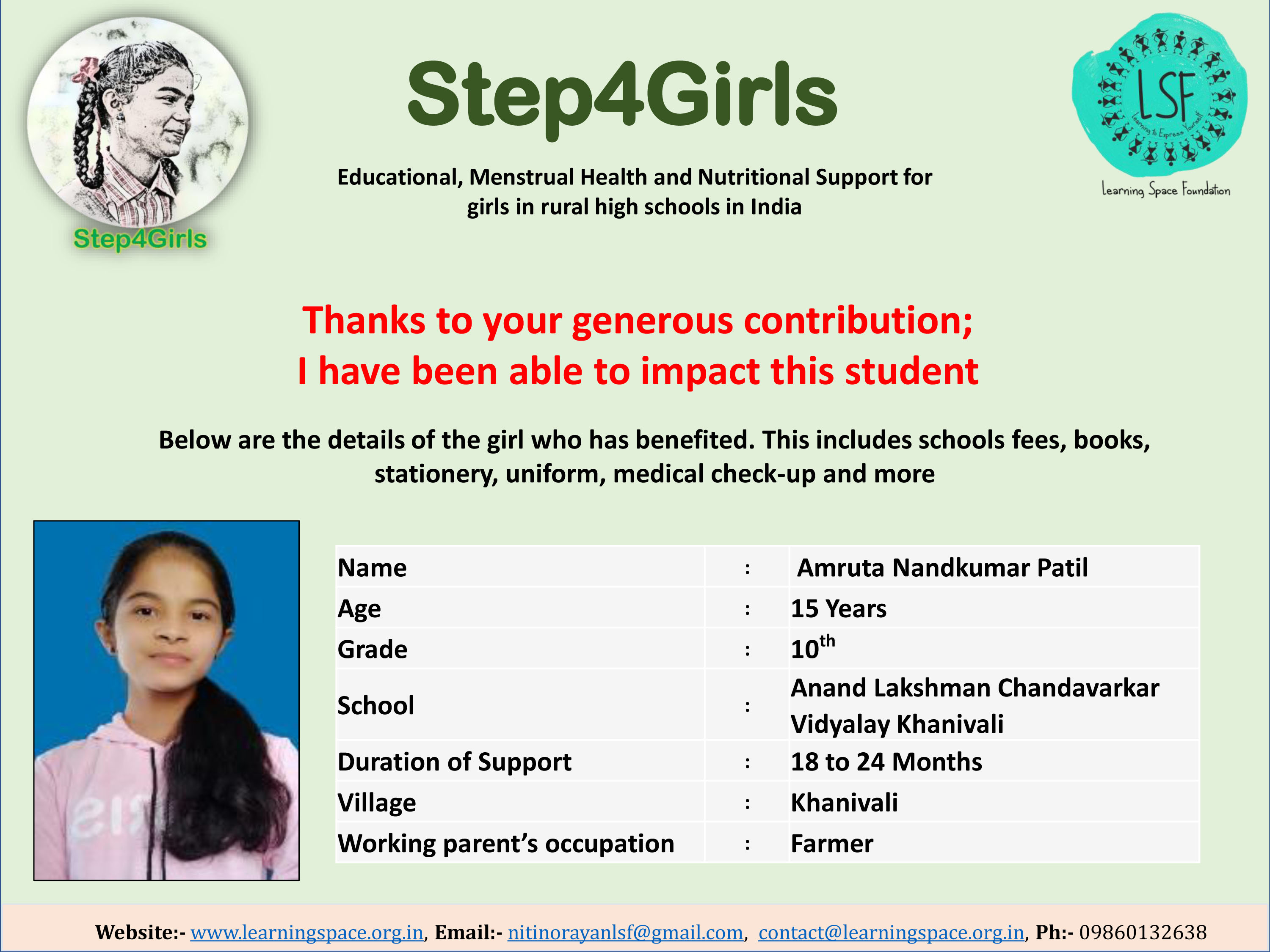 I was thrilled to learn about this initiative that provides education to underprivileged girls in Palghar and Thane districts. This will help them continue their education and achieve their dreams. Just INR 12000 will support their education for an entire year.