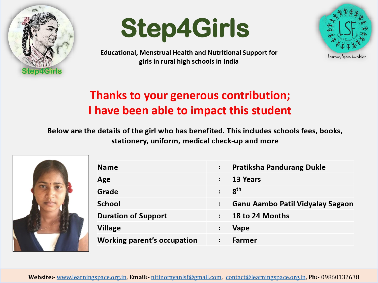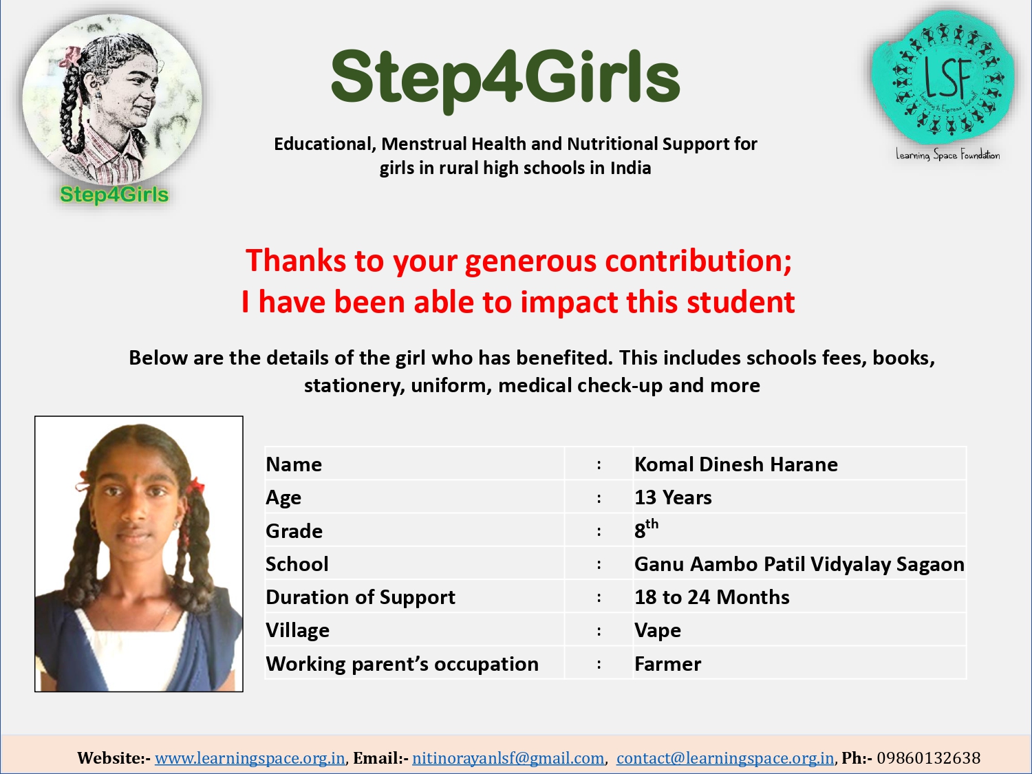 To ensure that there is complete transparency, the team at Learning Space Foundation will post feedback about 2-3 months after the campaign gets over telling us which student benefitted from the funding. The details will then be posted on the UPDATES section of my campaign and will be in a format like the one below. Once the update is posted the platform will send an EMAIL alert to you. Click on the link and you can read about which child has benefitted. That's transparent right.