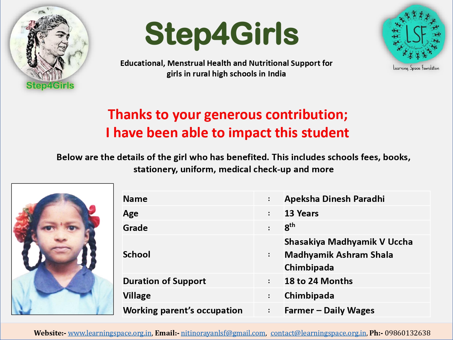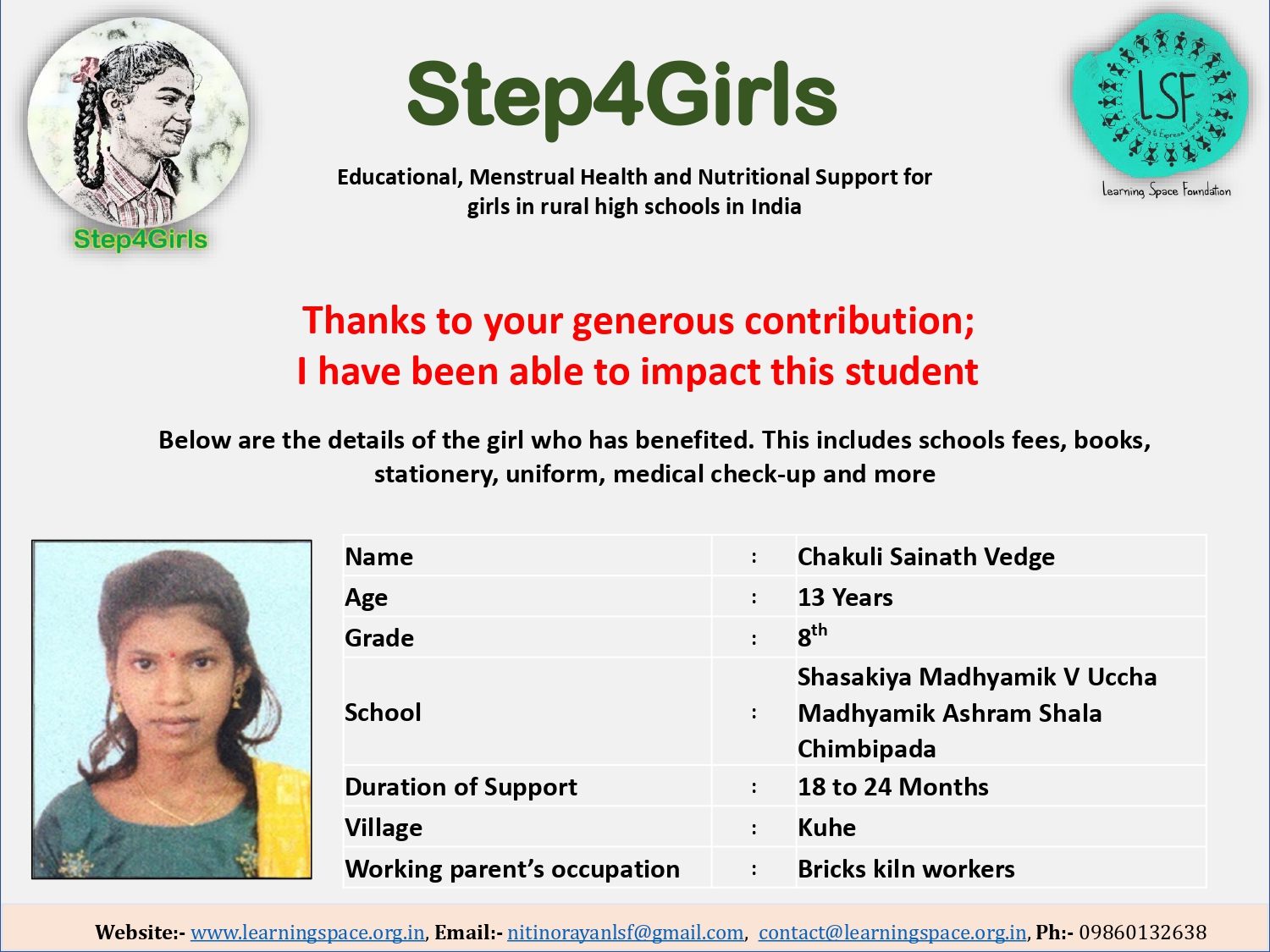 To ensure that there is complete transparency, the team at Learning Space Foundation will post feedback about 2-3 months after the campaign gets over telling us which student benefitted from the funding. The details will then be posted on the UPDATES section of my campaign and will be in a format like the one below. Once the update is posted the platform will send an EMAIL alert to you. Click on the link and you can read about which child has benefitted. That's transparent right.