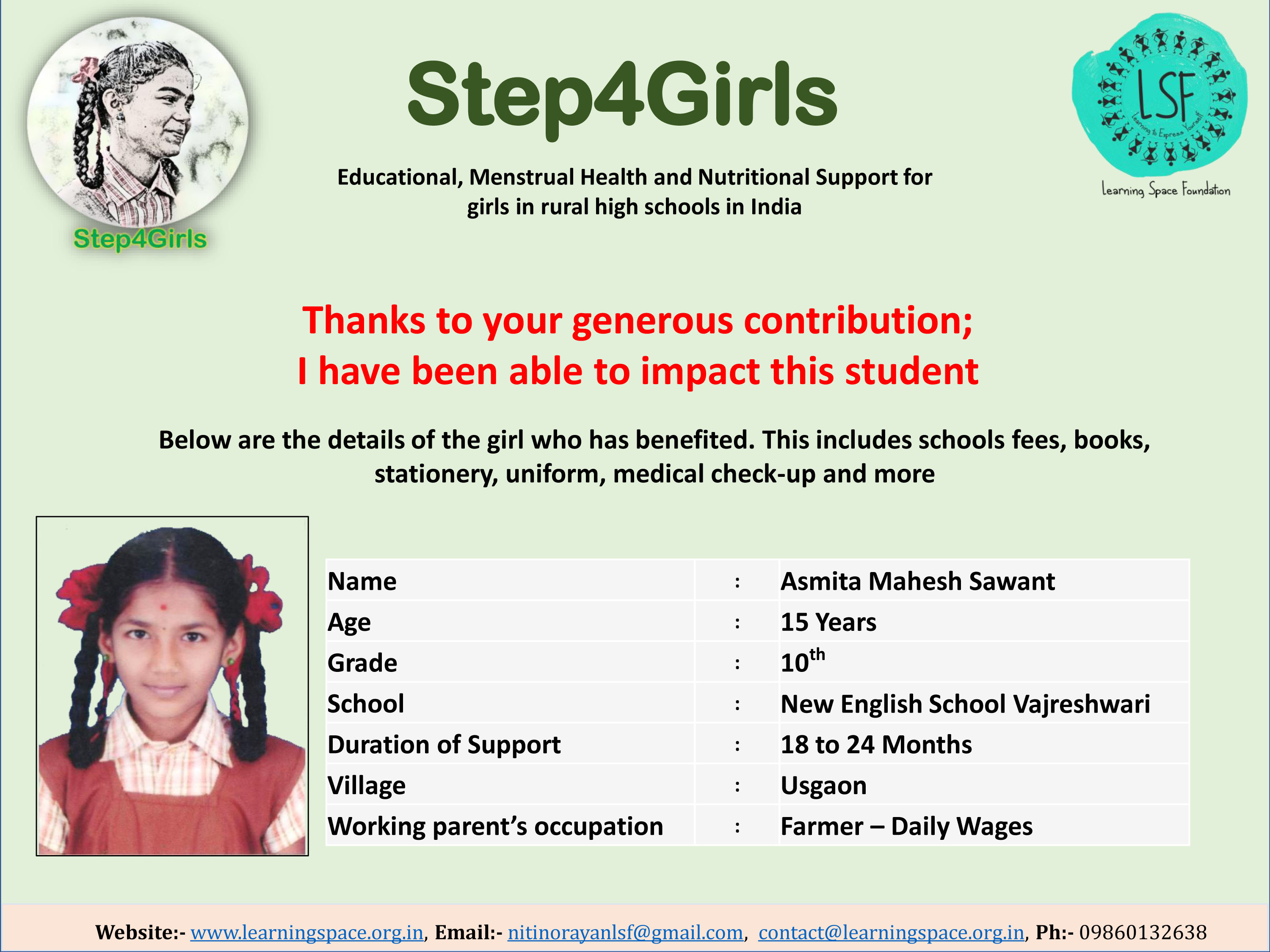 I was thrilled to learn about this initiative that provides education to underprivileged girls in Palghar and Thane districts. This will help them continue their education and achieve their dreams. Just INR 12000 will support their education for an entire year.